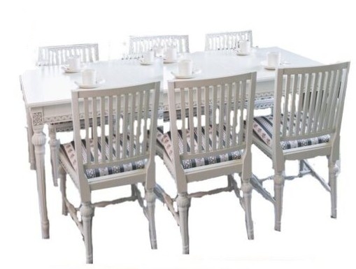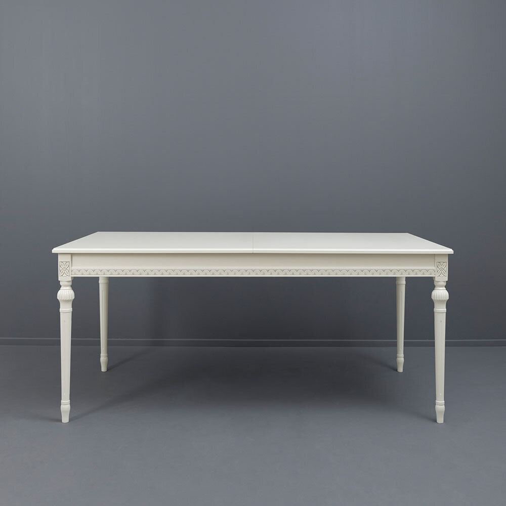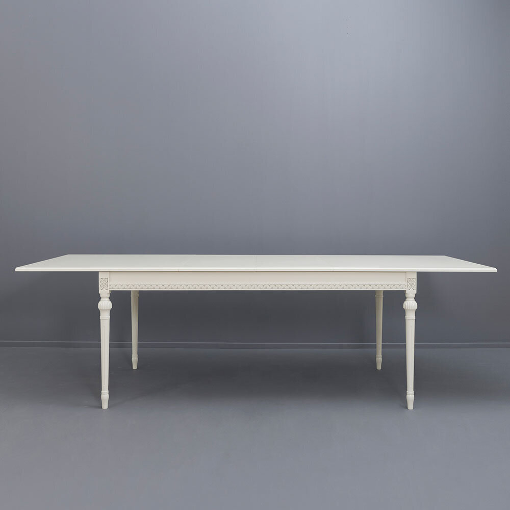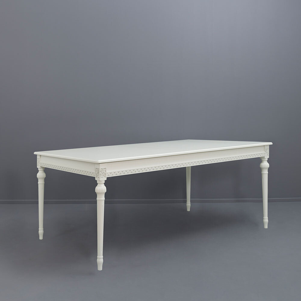 Tämä kotimainen ruokailuryhmä sisältää pöydän kahdella jatkolevyllä sekä kuusi tuolia, ja lisätuoleja on mahdollista tilata erikseen sivuiltamme lisää. Suomessa käsityönä valmistetut Kustavilaiset kalusteet edustavat ajattoman tyylikästä muotoilua ja erinomaista laatua – saatavana useissa väreissä sekä käsin maalatulla kullan- tai harmaanvärisellä patinoinnilla.