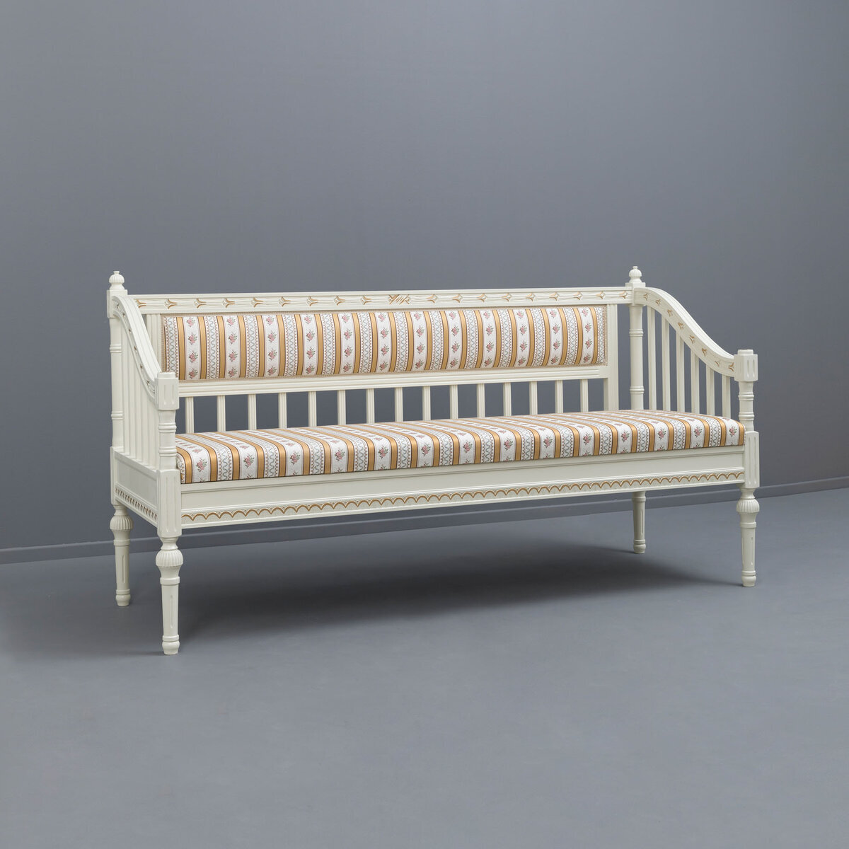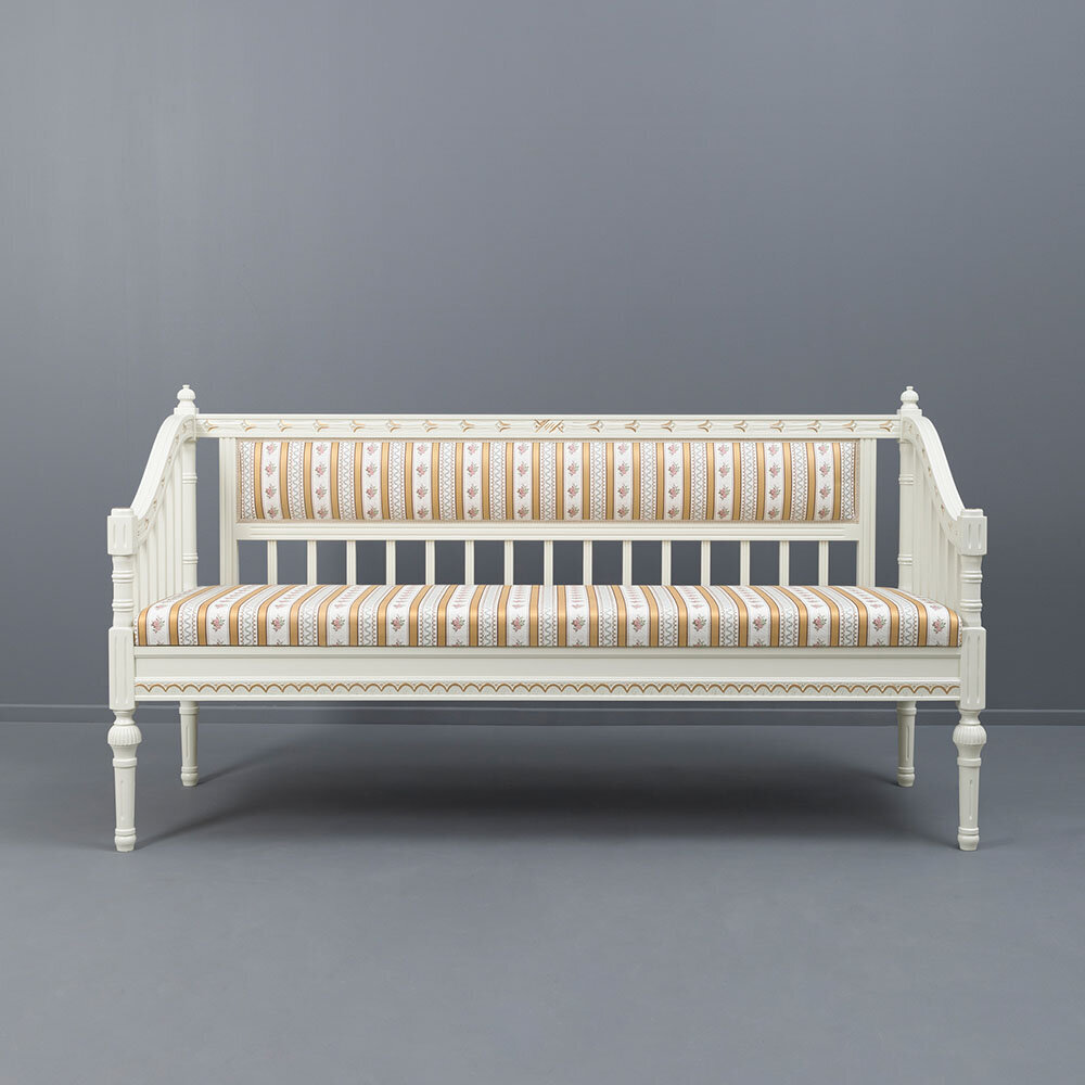 Tämä kotimainen Kustavilainen sohva hurmaa klassisella muotoilullaan ja laadukkaalla kangasverhoilulla. Sohva voidaan verhoilla myös muilla kankailla, ja lisäarvokkuutta tuovat käsin maalatut kullan- tai harmaanväriset patinoinnit.