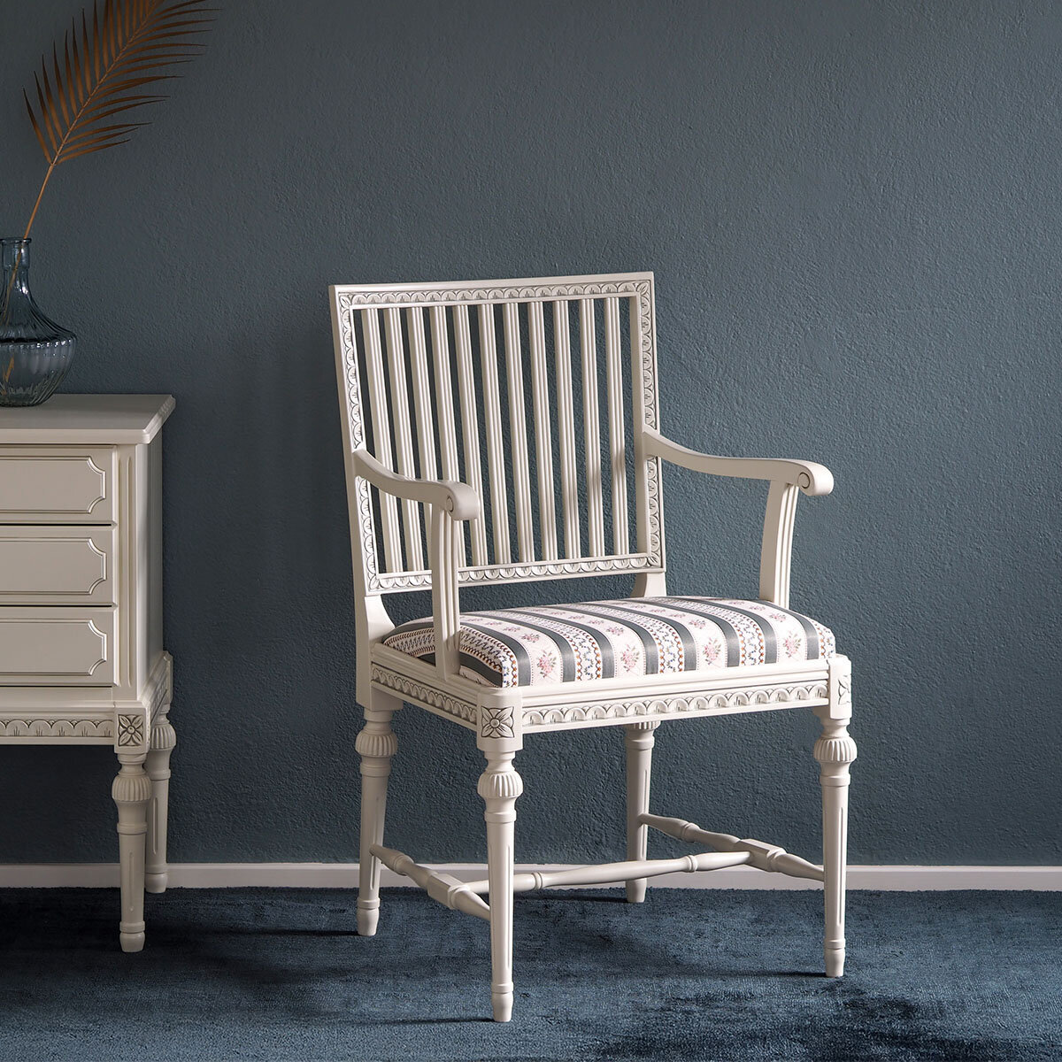 tuo kotiisi kartanotyylin arvokkuutta ja sopii kauniisti niin ruokapöydän ympärille kuin lipaston tai kaapin pariksi. Saatavana useilla kankailla sekä käsin maalatulla kulta- tai harmaapatinoinnilla – kotimainen käsityö takaa laadun ja tuoli toimitetaan valmiiksi koottuna.