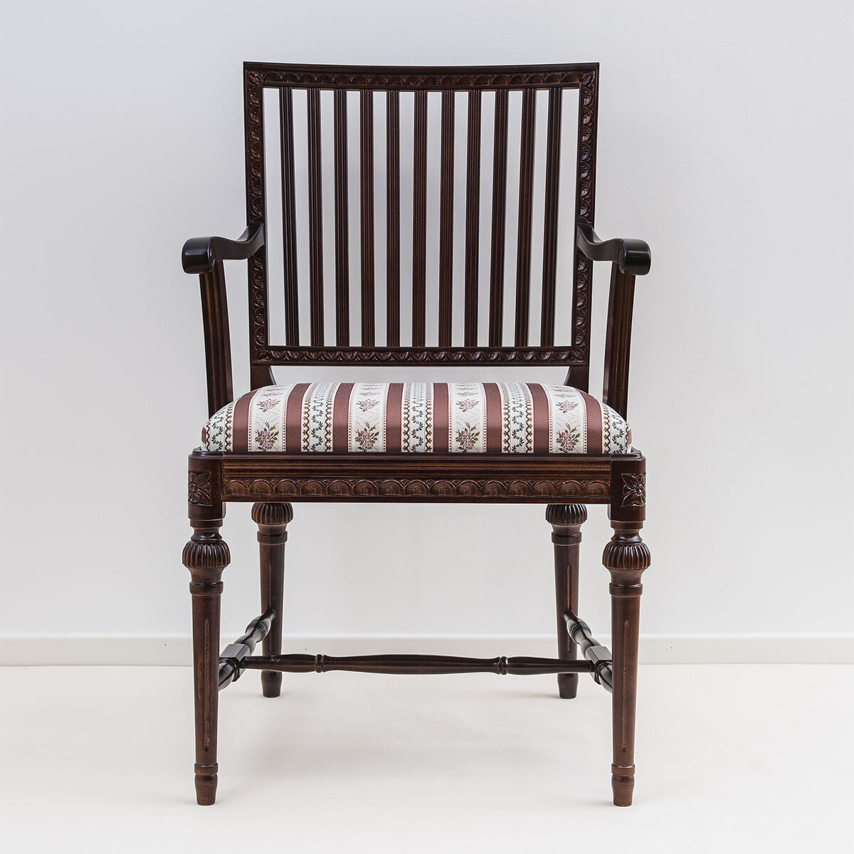 Kustavilainen tuoli tuo sisustukseen kartanotyylin arvokkuutta, mutta sopii kauniisti myös moderniin kotiin. Tuoli toimii yhtä hyvin ruokapöydän ympärillä kuin seinustalle sijoitettuna lipaston tai kaapin molemmin puolin. Kustavilaistyyliset kapenevat jalat tekevät ilmeestä siron, ja englantilaisvaikutteinen H-ristikko varmistaa tukevan rakenteen. Selkänojaa ja istuinta kiertää näyttävä keisarinlehtikuvio, joka viimeistelee klassisen tyylin.
