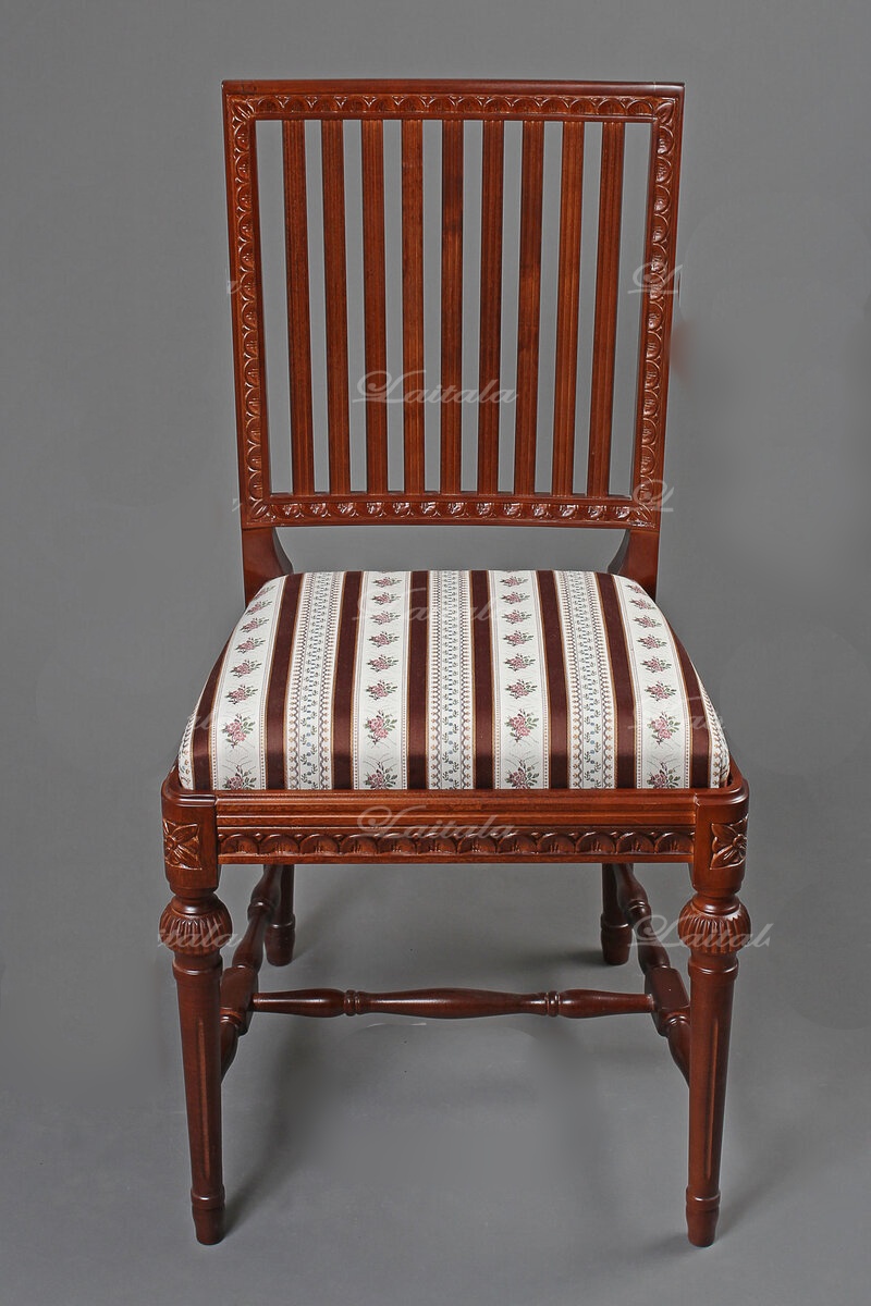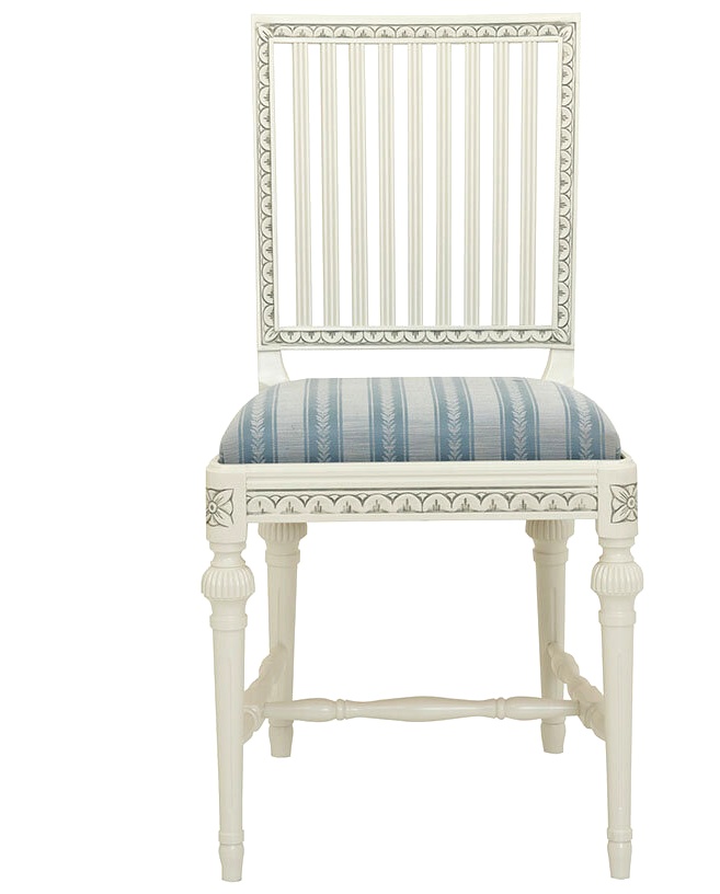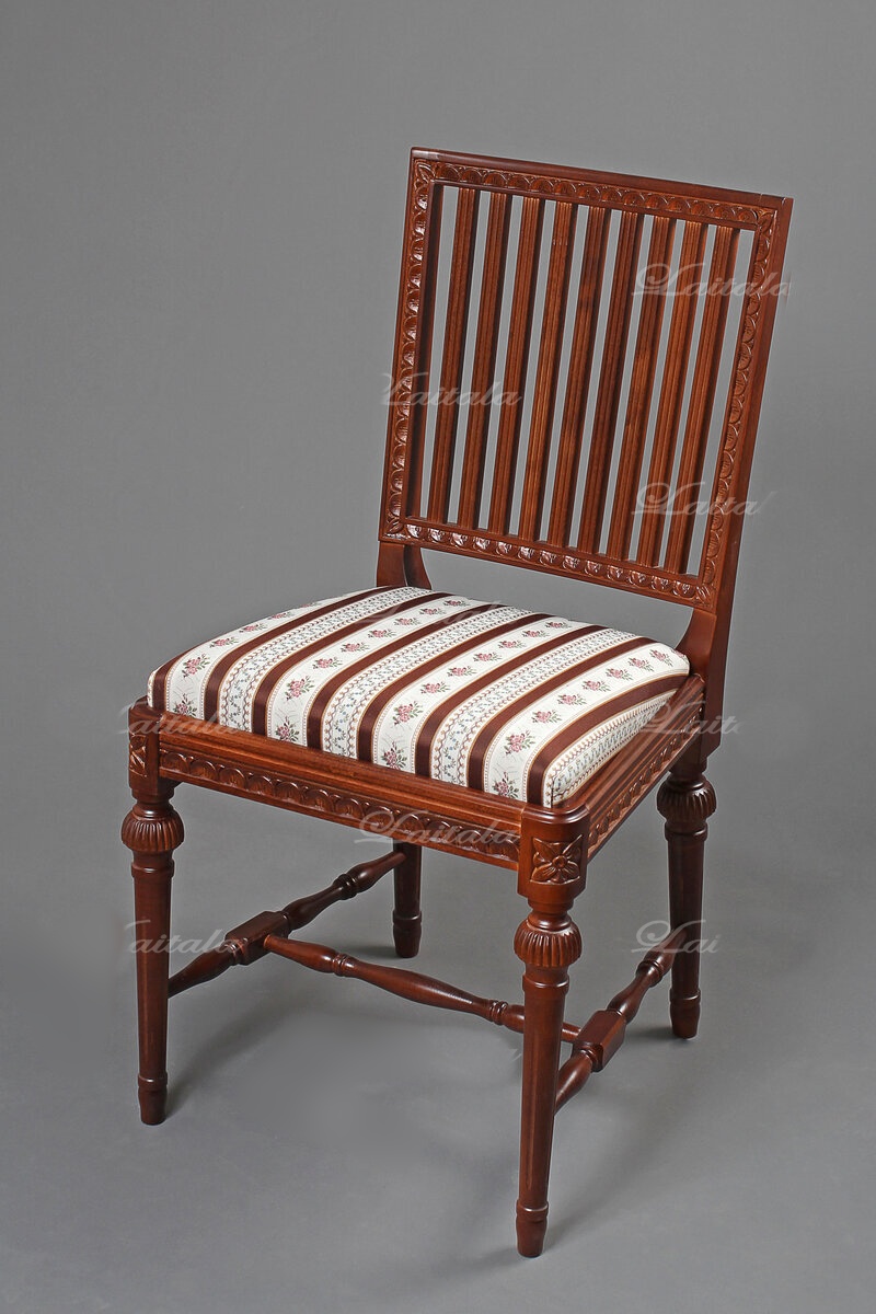 Kustavilainen tuoli tuo kotiisi hovityylin arvokkuutta ja sopii loistavasti niin ruokapöydän ääreen kuin kaapin tai lipaston molemmin puolin sijoitettavaksi. Keveän siron ilmeen luovat alaspäin kapenevat jalat, ja tukevuutta lisää englantilaisvaikutteinen H-ristikko. Näyttävä keisarinlehtikuvio selkänojassa ja istuinosassa viimeistelee elegantin kokonaisuuden.