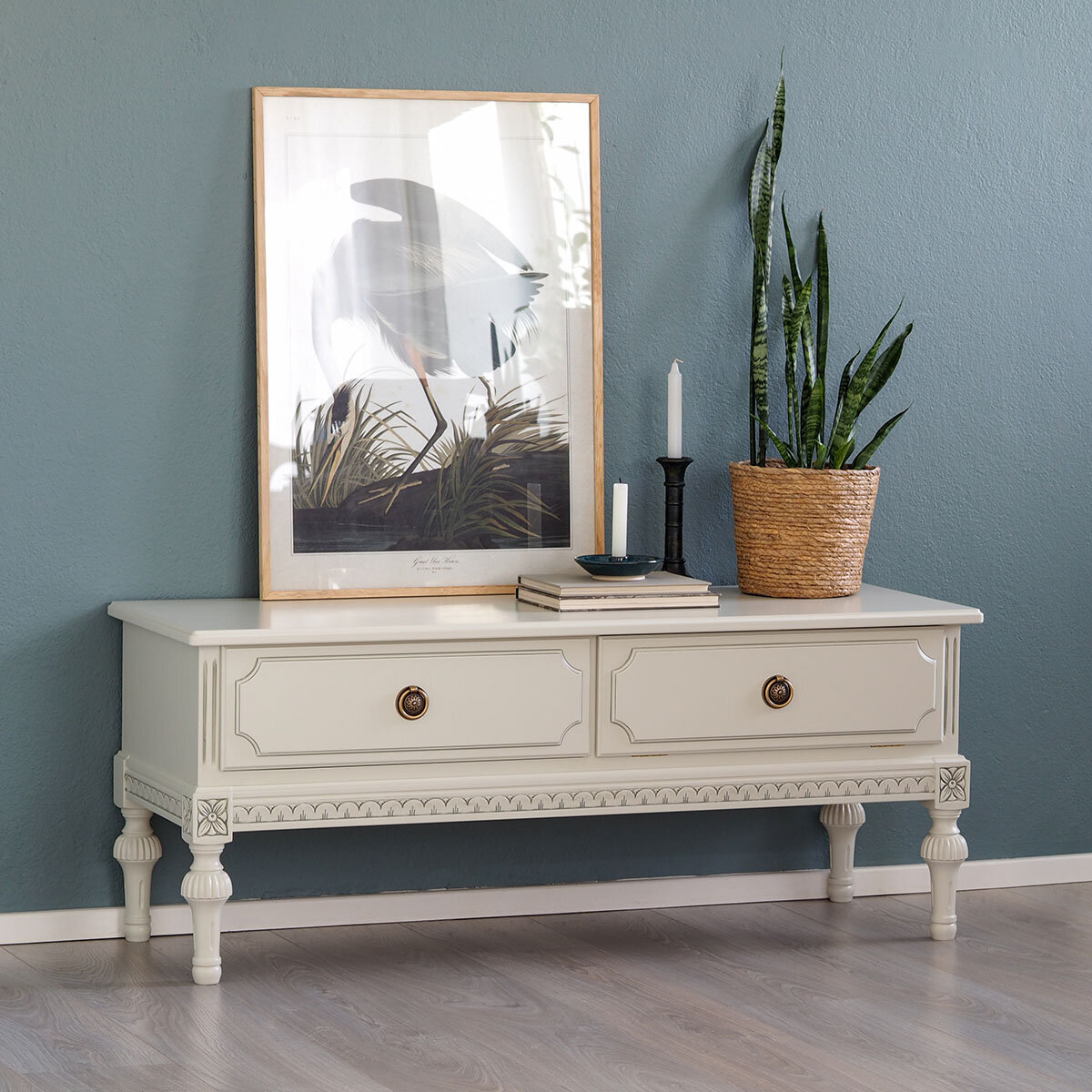 Kotimainen Kustavilainen tv-taso kahdella laatikolla yhdistää klassisen tyylin ja käytännöllisen säilytystilan, täydellinen olohuoneen keskipisteeksi. Saatavana useissa väreissä ja verhoiluissa, lisähinnasta myös käsin maalatulla kulta- tai harmaapatinoinnilla – toimitetaan valmiiksi koottuna.