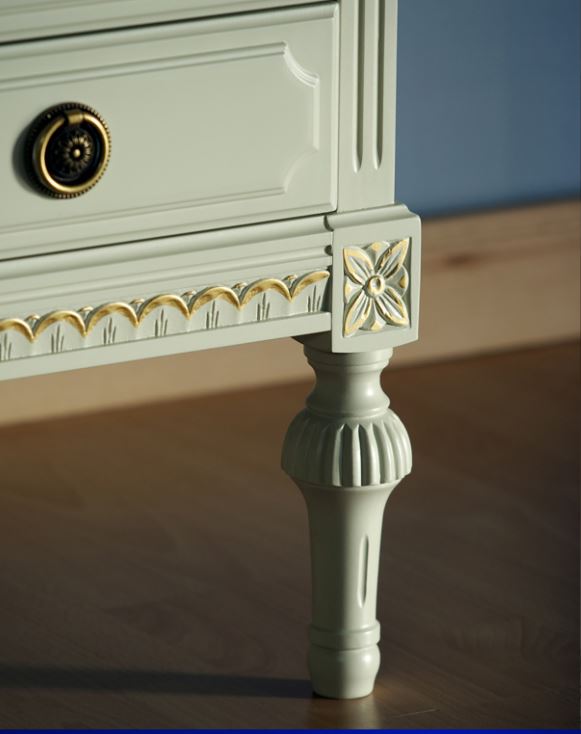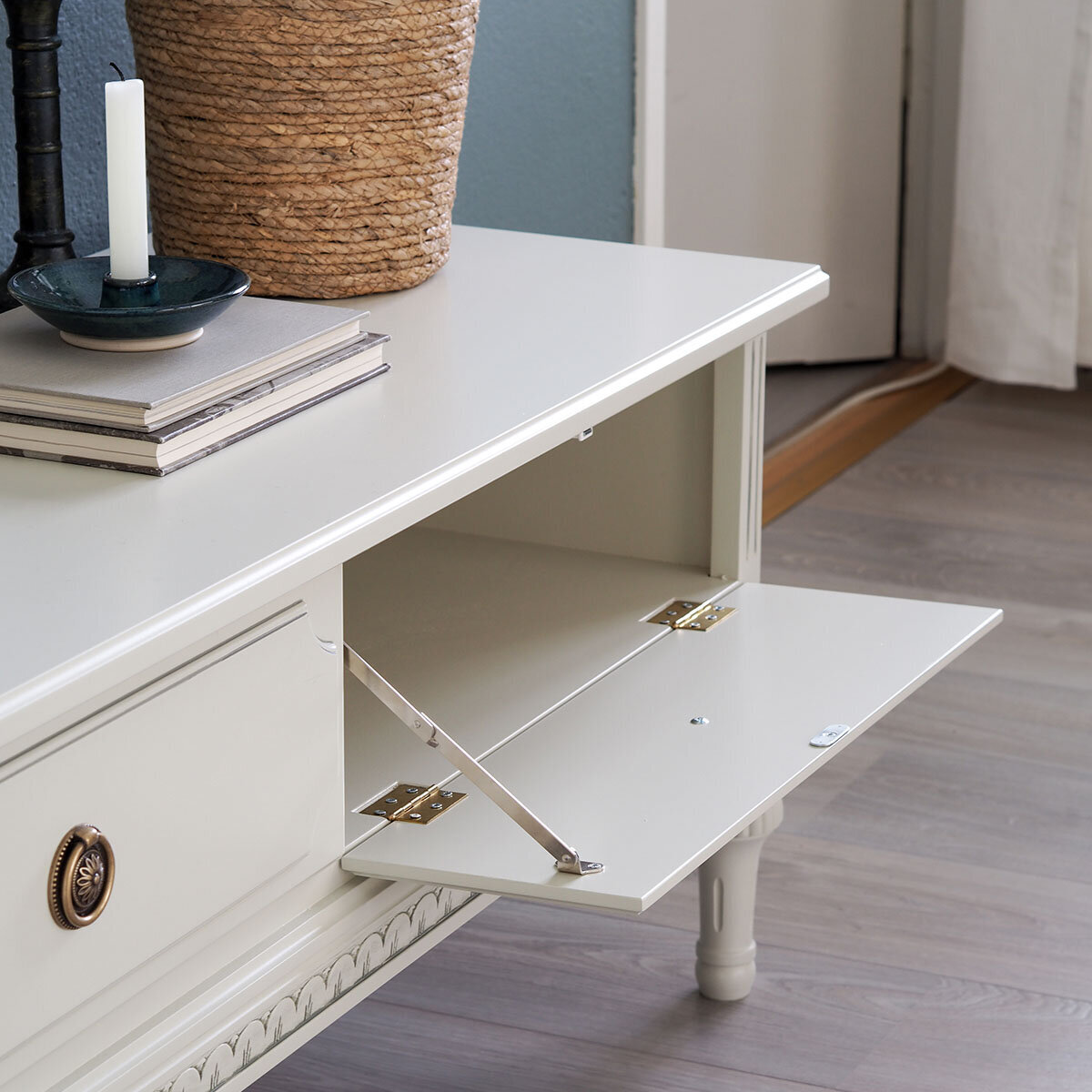 Sarjan tuotteet ovat saatavilla useissa väreissä ja verhoiluissa, ja lisähinnasta saat tv-tasoon käsin maalatun kullan- tai harmaanvärisen patinoinnin, joka korostaa sen yksityiskohtia upeasti.