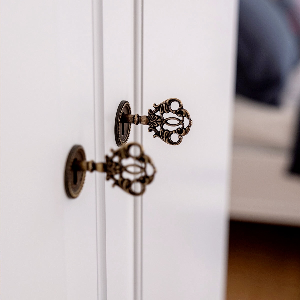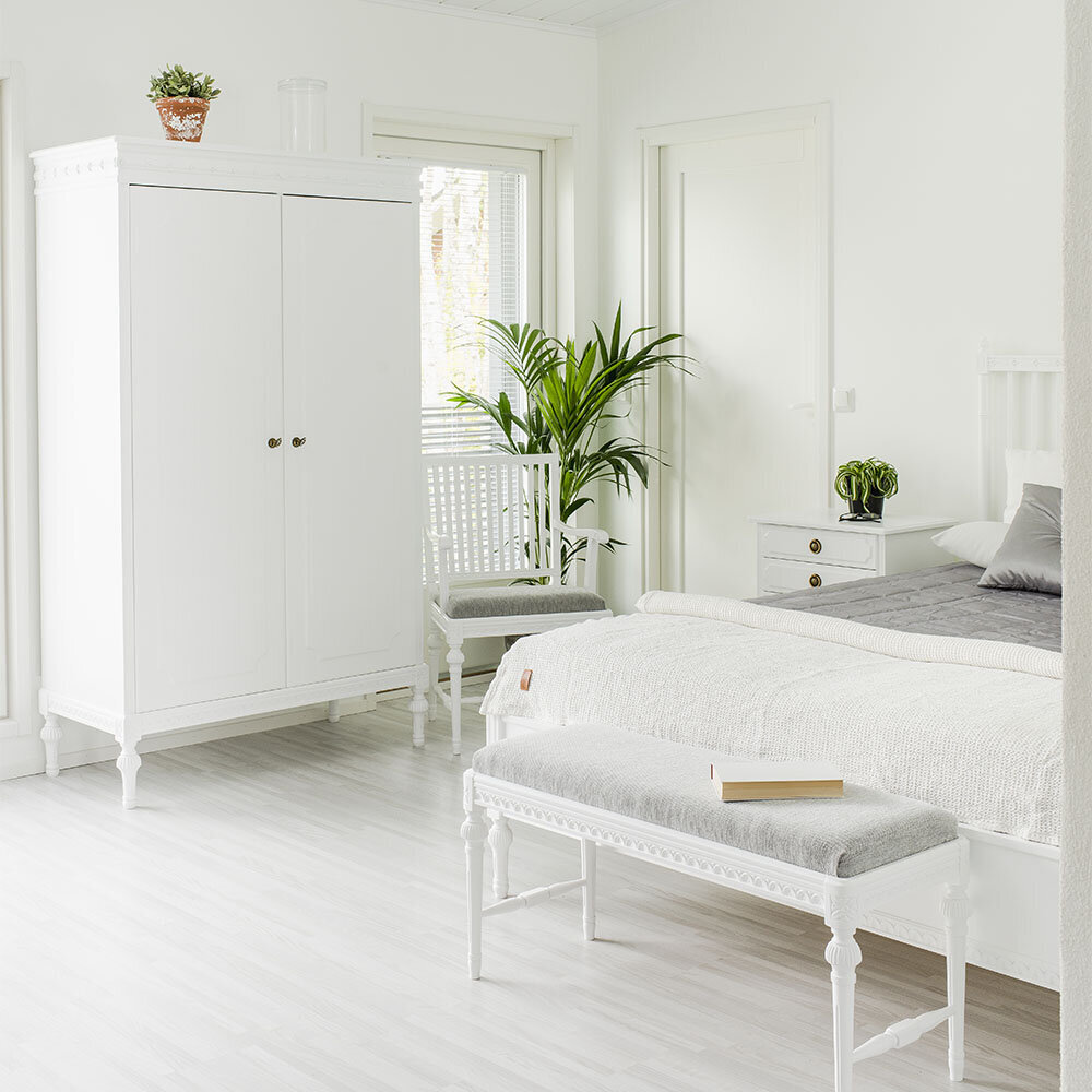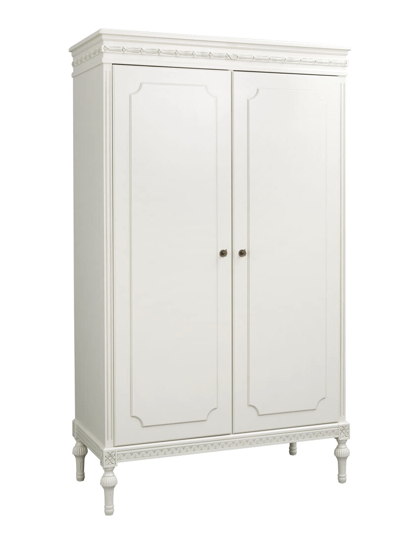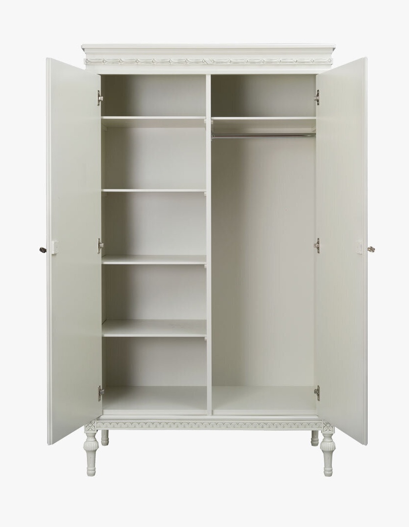 tarjoaa monipuolista säilytystilaa vaatetangolla, ylähyllyllä ja neljällä hyllylevyllä, sekä lukittavat ovet antiikkipatinoiduilla messinkisilla yksityiskohdilla. Saatavana useissa väreissä sekä käsin maalatulla kulta- tai harmaapatinoinnilla – laadukas kotimainen käsityö viimeistelee kokonaisuuden.