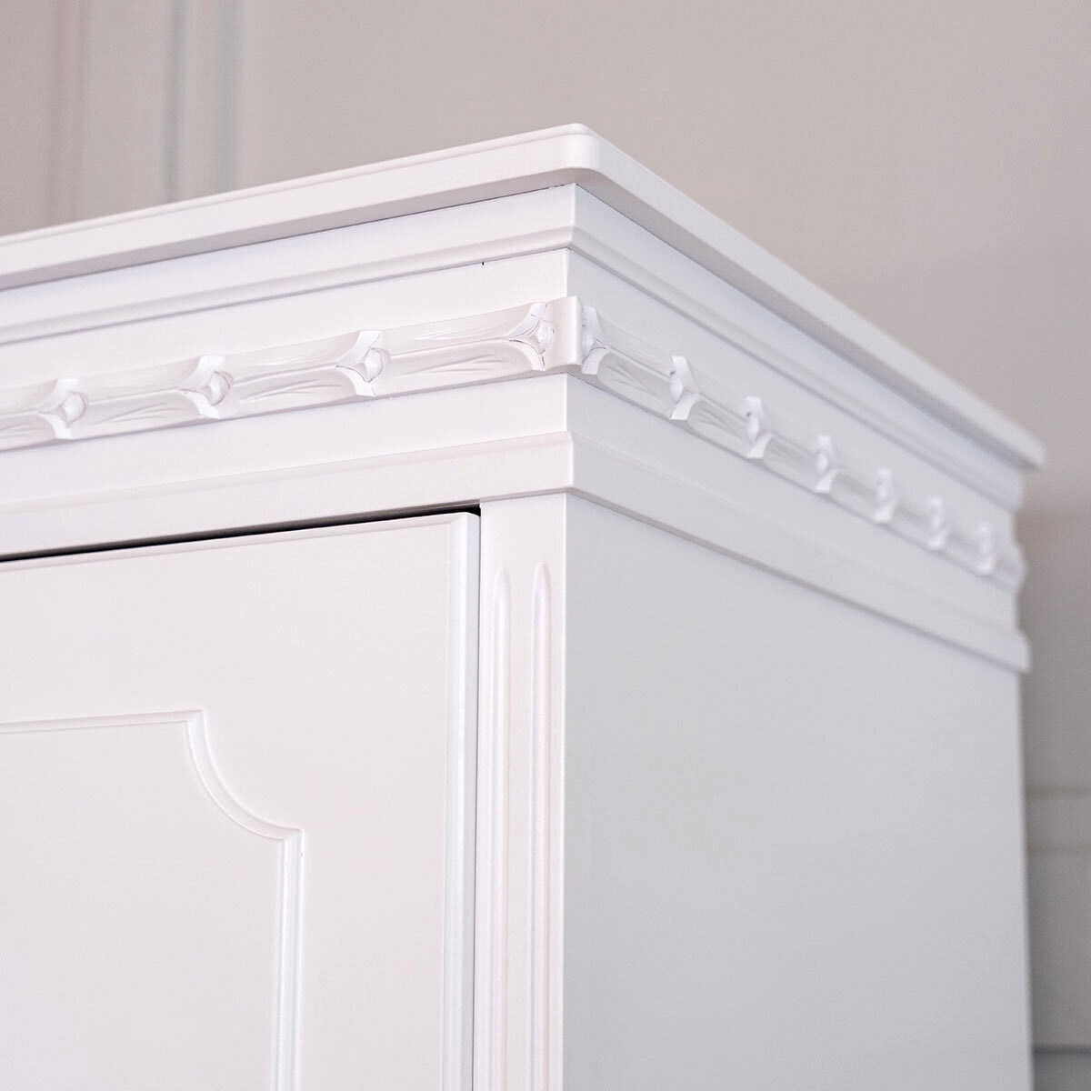 Kaappi on saatavana useissa väreissä, ja halutessasi sen voi viimeistellä käsin maalatulla kullan- tai harmaanvärisellä patinoinnilla, joka korostaa tyylikkäitä yksityiskohtia. Huolellinen kotimainen käsityö takaa erinomaisen laadun ja ajattoman eleganssin – vaatekaapin, joka kestää vuosikymmenet.
