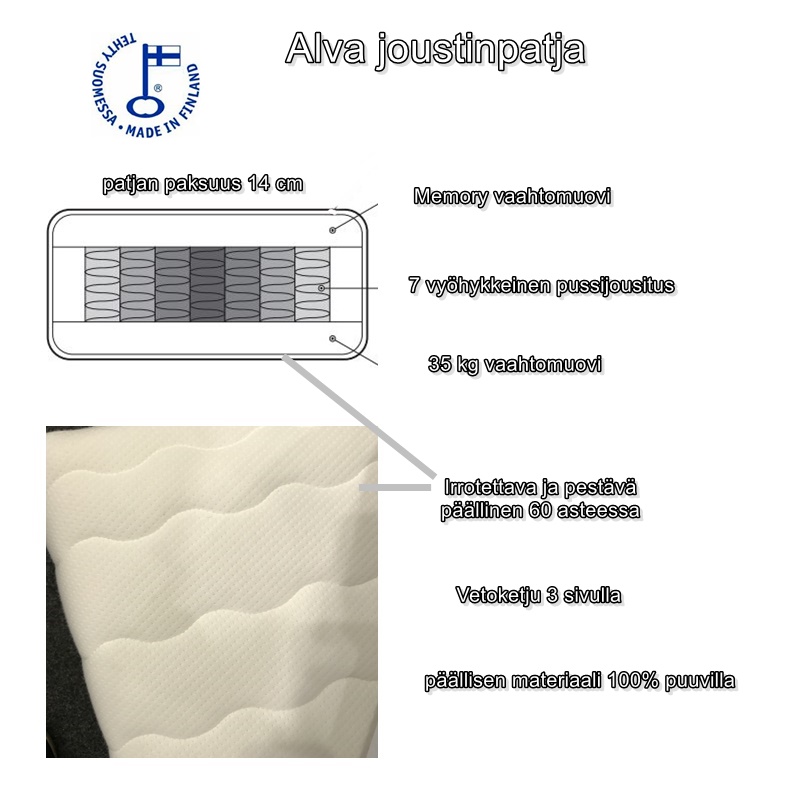 Laatu-sänkyyn voit valita korkealaatuiset joustin- ja sijauspatjat, jotka takaavat optimaalisen tuen ja pehmeyden. Mukaan voit hankkia myös sijauspatjansuojiä sekä XXL-vaihtoehtoja, kuten extra-tukijalan ja patjan jopa 160 kg painorajalla, jotta sänky vastaa täydellisesti käyttäjän tarpeisiin. Näin Laatu-seniorisängystä muodostuu turvallinen, toimiva ja pitkäikäinen ratkaisu arjen mukavuuteen.