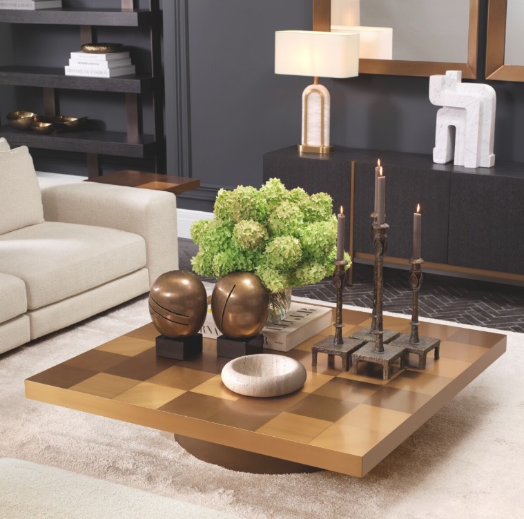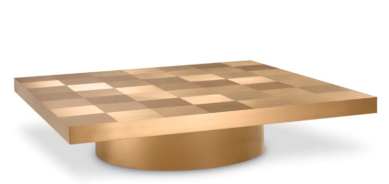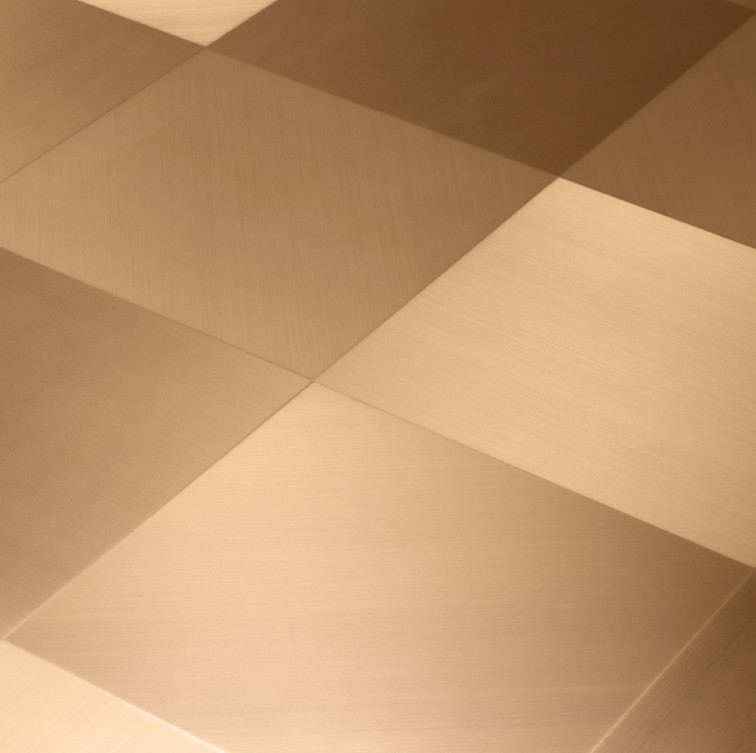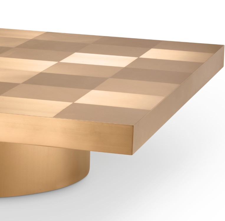 Pöydän elegantti harjattu messinkipinta huokuu hienostuneisuutta ja lämpöä. Erityinen valmistustekniikka, jossa pintaa on harjattu eri suuntiin, luo upean neliökuvion, joka elää valon mukana ja tuo pintaan syvyyttä sekä ainutlaatuista tekstuuria.