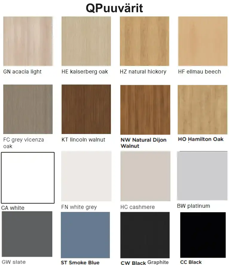 Runkoväreinä ovat tyylikkäät musta, harmaa ja kromi, ja kansivärit ovat saatavana Q-puuväreissä, mikä mahdollistaa harmonisen ilmeen erilaisiin sisustuksiin. Vankka rakenne ja huolella valitut materiaalit takaavat pitkäikäisen ja ammattikäyttöön soveltuvan pöydän.