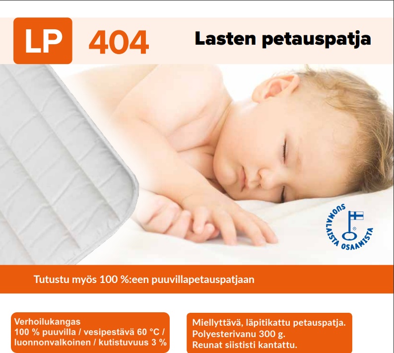 Lasten sijauspatja yhdistää kotimaisen laadun, puhtaan luonnonmateriaalin ja helpon hoidettavuuden – ihanteellinen valinta lapsen hyvinvointiin ja vanhemman mielenrauhaan. Saatavana useassa eri koossa.