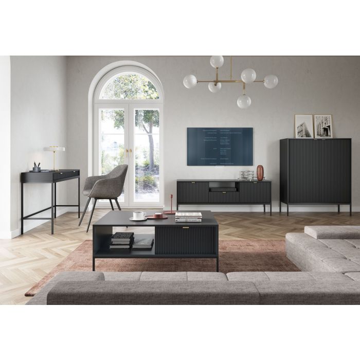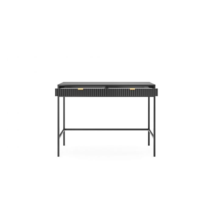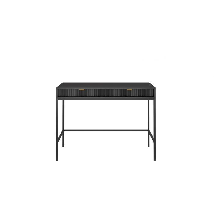 Kaksi vetolaatikkoa tarjoavat kätevää säilytystilaa, ja niiden 18 mm MDF-etusarjat korostuvat kauniilla urakuvioinnilla sekä harjatuilla kullanvärisillä alumiinivetimillä. Kokonaisuus yhdistää käytännöllisyyden ja näyttävät yksityiskohdat harmoniseksi työpisteeksi.