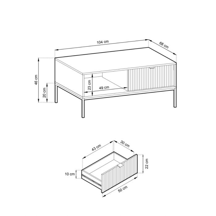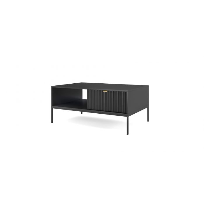 Sohvapöydässä on kaksi vetolaatikkoa – yksi molemmilla puolilla pöytää – sekä avohylly, jotka tarjoavat runsaasti tilaa arjen tavaroille. 18 mm paksusta MDF-levystä valmistetut laatikon etusarjat, harjatut kullanväriset alumiinivetimet ja uritettu pinta antavat pöydälle kauniin, yksilöllisen ilmeen, joka sopii moderniin sisustukseen.
