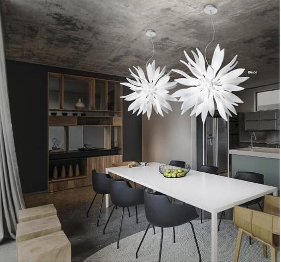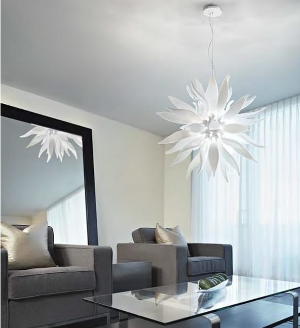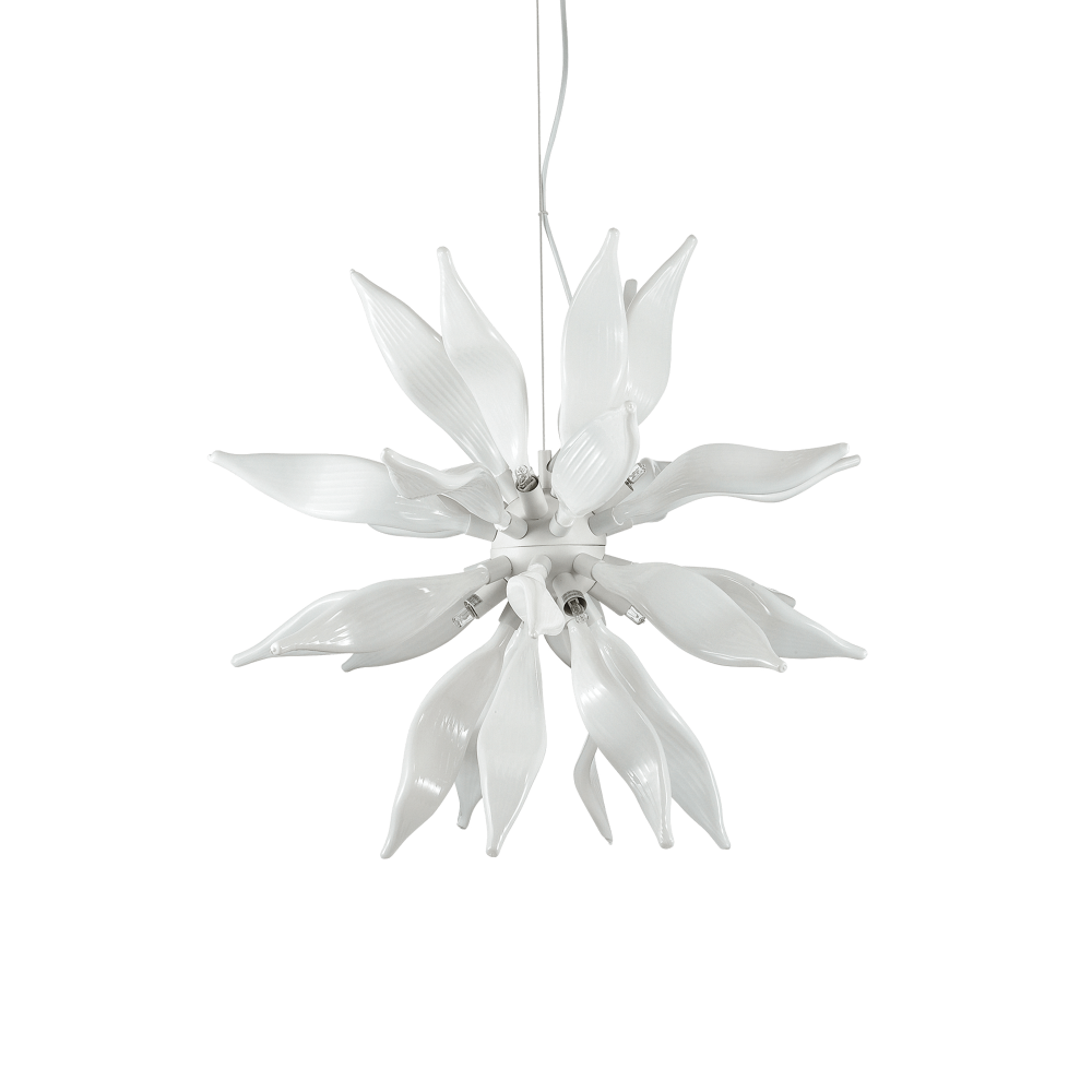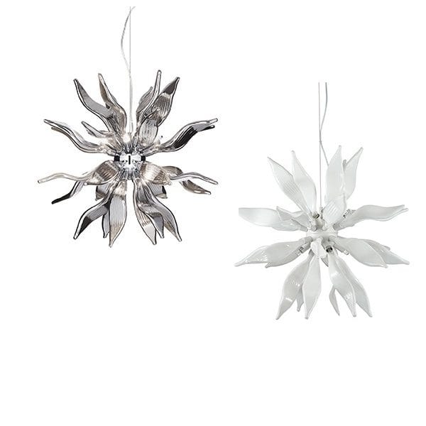 • Moderni riippuvalaisin jonka korkeutta voidaan säätää teräsvaijereista. Valaisimessa metallirunko jossa käsinpuhallettuja lasilehtiä.  Desing Italia. Toimitus osissa.