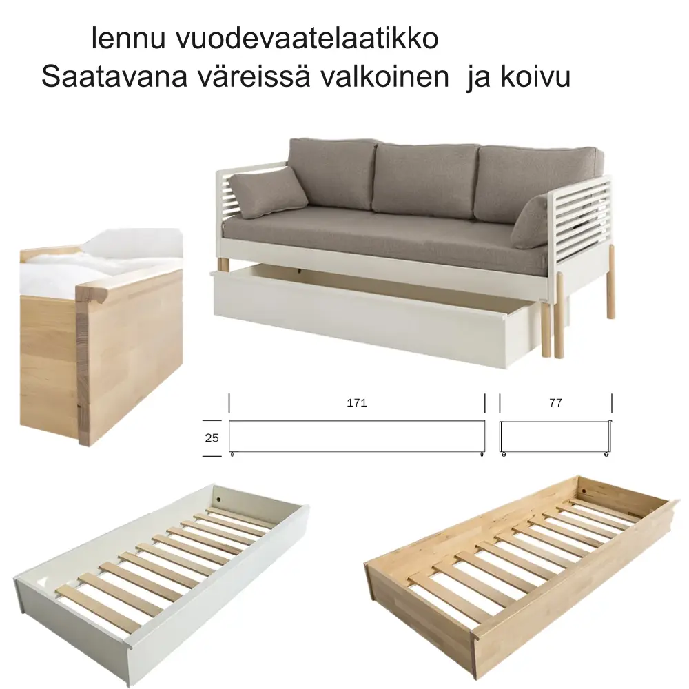 kuten koivu, musta  ja valkoinen. Lisäksi voit täydentää kokonaisuutta vuodesohvaan sopivalla vuodevaatelaatikkolla. Lennu vuodesohva on erinomainen valinta sinulle, joka arvostat laadukasta käsityötä, kestävyyttä ja tyylikkyyttä. Tilaa oma lennu vuodesohva jo tänään!
