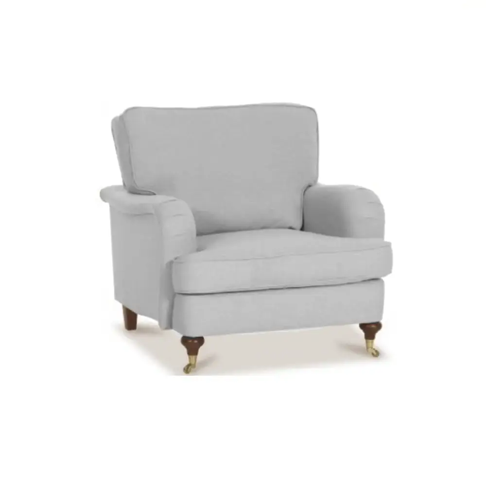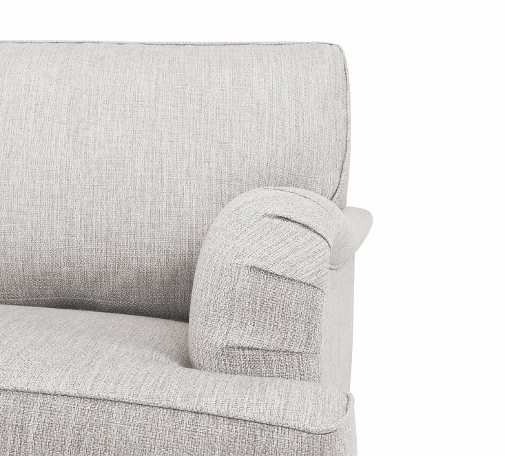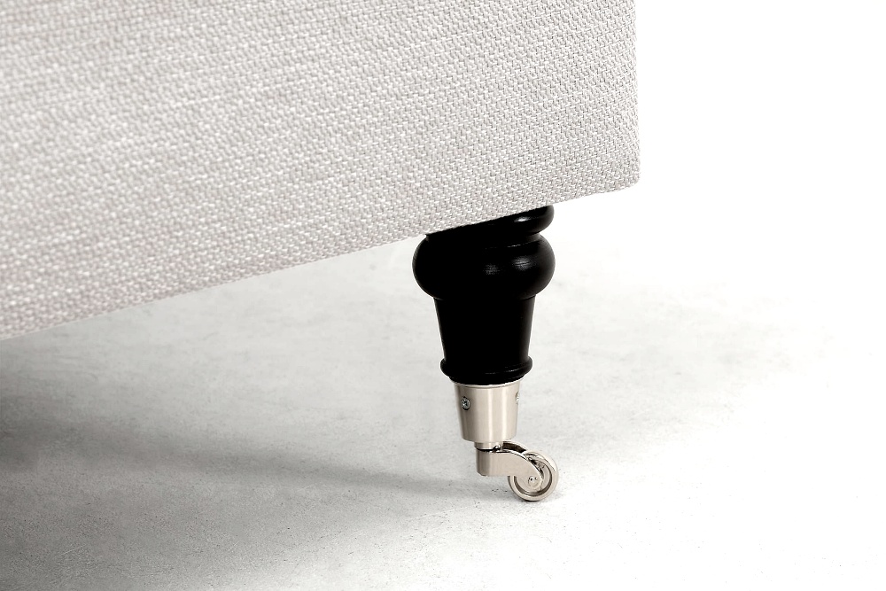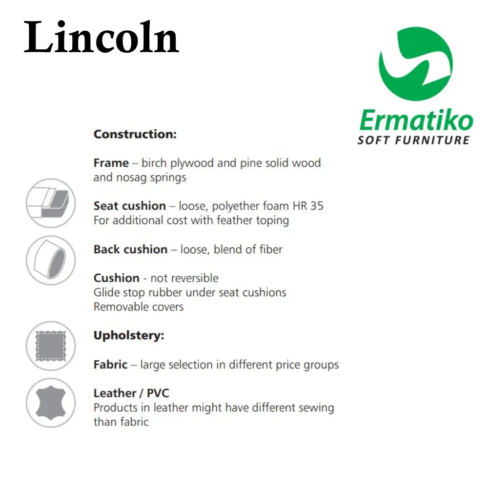 Lincoln-nojatuolissa on no-sag-jousitus ja laadukkaat pehmusteet, jotka takaavat miellyttävän rennon mutta tukevan istuintuntuman. Irtonaiset istuintyynyt pysyvät siististi paikoillaan istuimen alle kiinnitetyn kumin ansiosta, ja tuolin etujalat pyörillä ovat sekä viehättävä että käytännöllinen yksityiskohta. Halutessasi voit täydentää kokonaisuuden käsinojasuojaparilla, joka valmistetaan samalla kankaalla kuin tuoli itse.