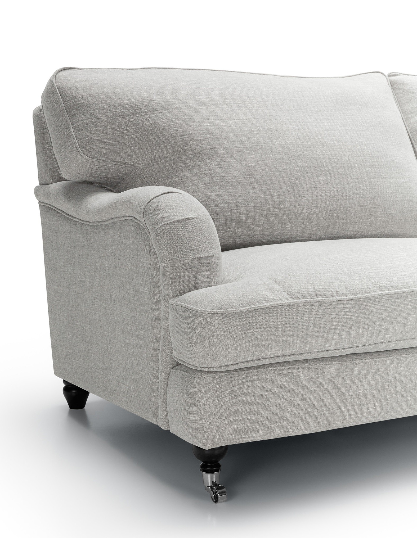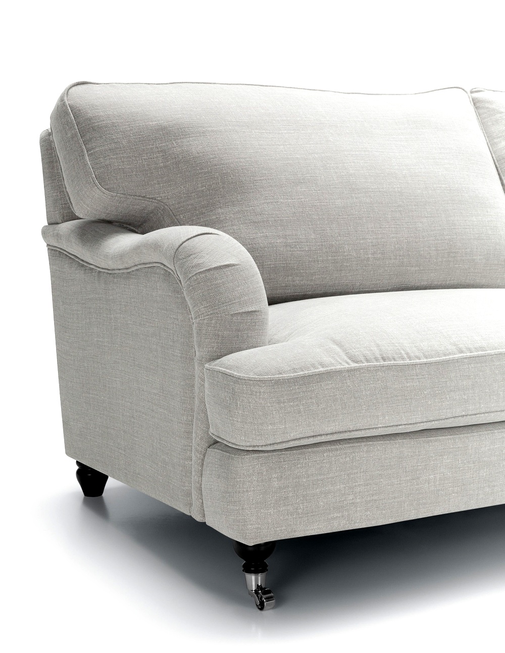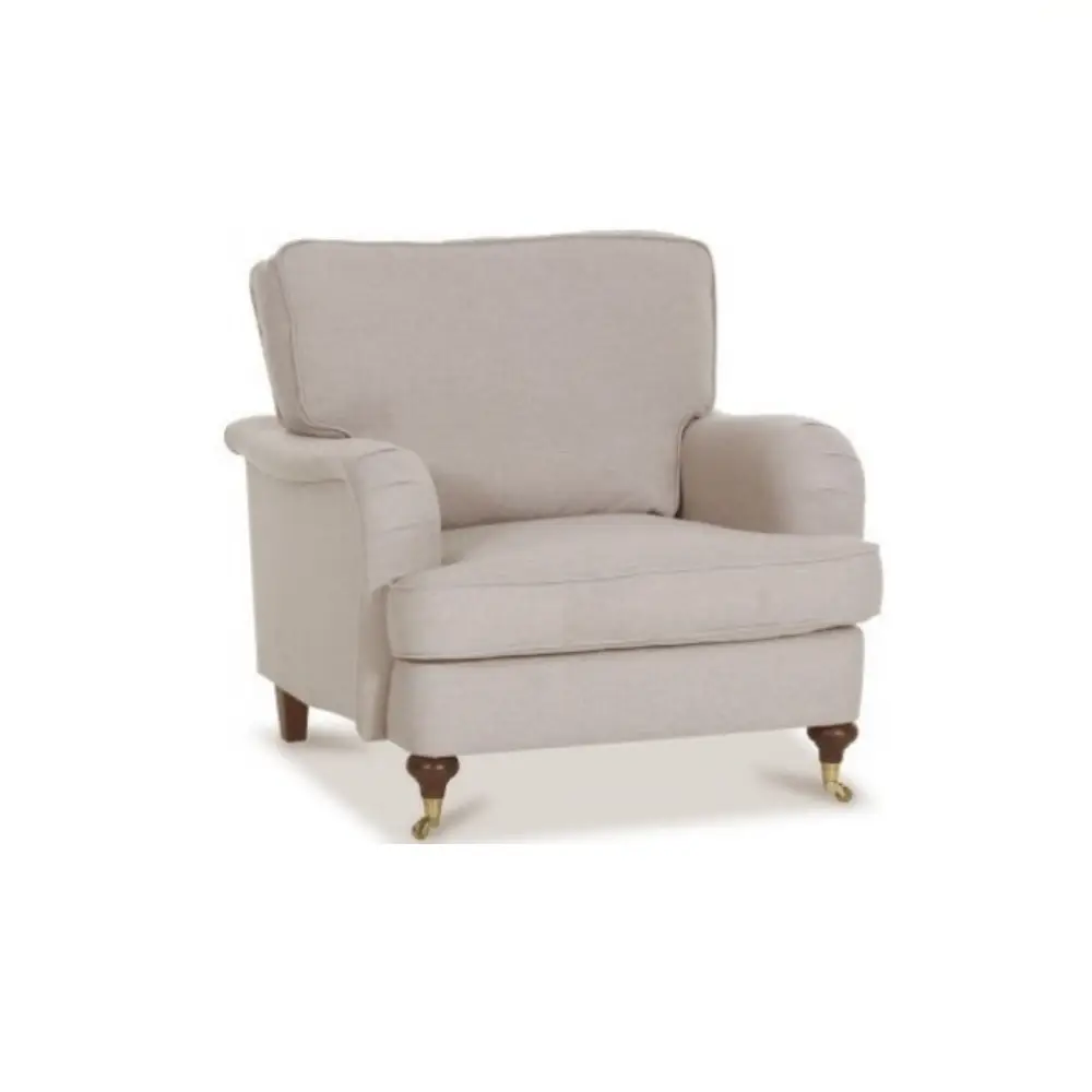 Lincoln-nojatuolissa on no-sag-jousitus ja laadukkaat pehmusteet, jotka takaavat miellyttävän rennon mutta tukevan istuintuntuman. Irtonaiset istuintyynyt pysyvät siististi paikoillaan istuimen alle kiinnitetyn kumin ansiosta, ja tuolin etujalat pyörillä ovat sekä viehättävä että käytännöllinen yksityiskohta. Halutessasi voit täydentää kokonaisuuden käsinojasuojaparilla, joka valmistetaan samalla kankaalla kuin tuoli itse.