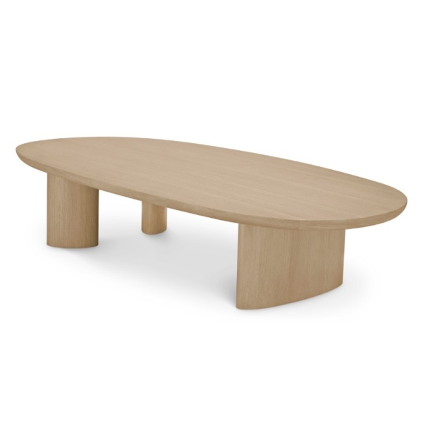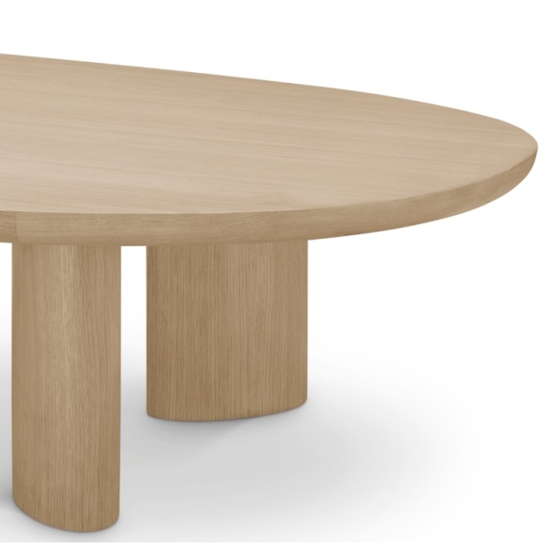 Ellipsin muotoiset jalat tarjoavat sekä vakautta että visuaalista keveyttä, luoden elegantin kokonaisuuden. Luonnollinen tammiviilu korostaa pöydän ajattomuutta ja kestävyyttä, tehden siitä pitkäikäisen valinnan arkeen ja juhlaan.