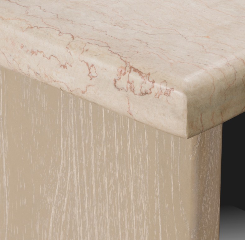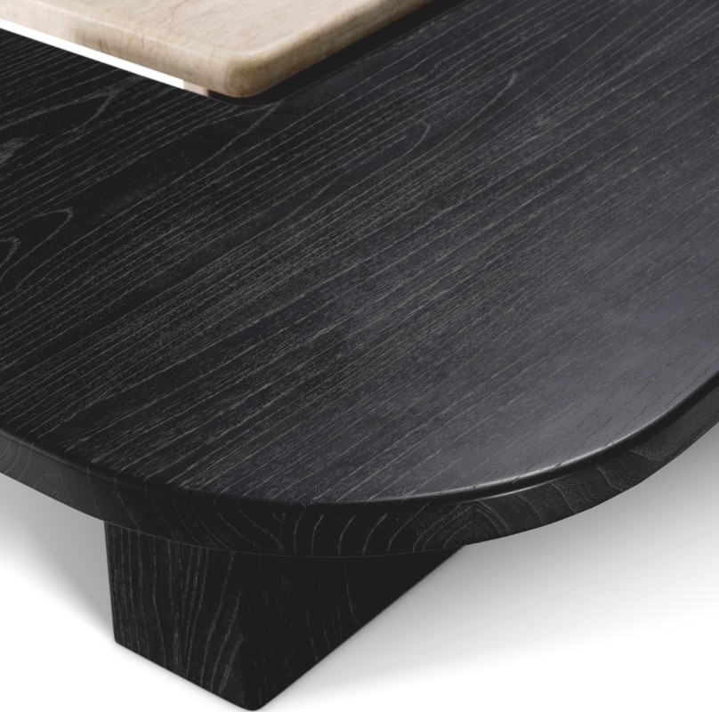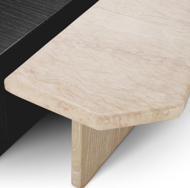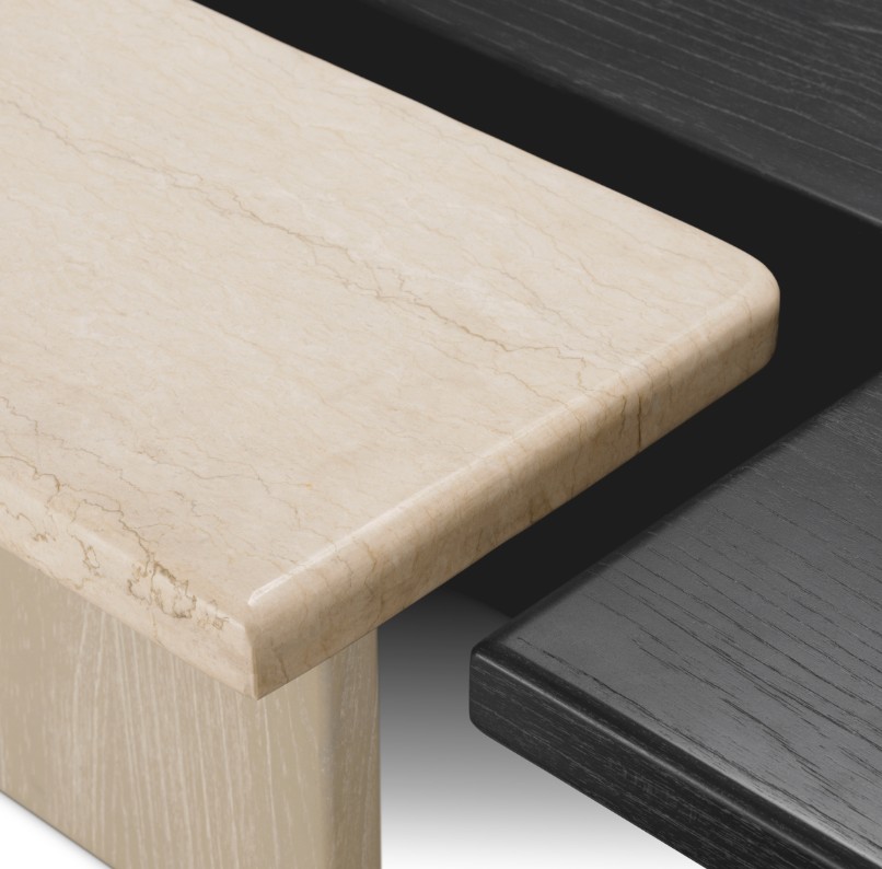 Setti yhdistää tyylikkään hiilenharmaan viilupinnan ja elegantin beigen marmorikannen, jota tukee pestystä tammiviilusta valmistettu jalka. Materiaalien ja sävyjen kontrasti luo harmonisen tasapainon ja korostaa pöydän hienostunutta designia.