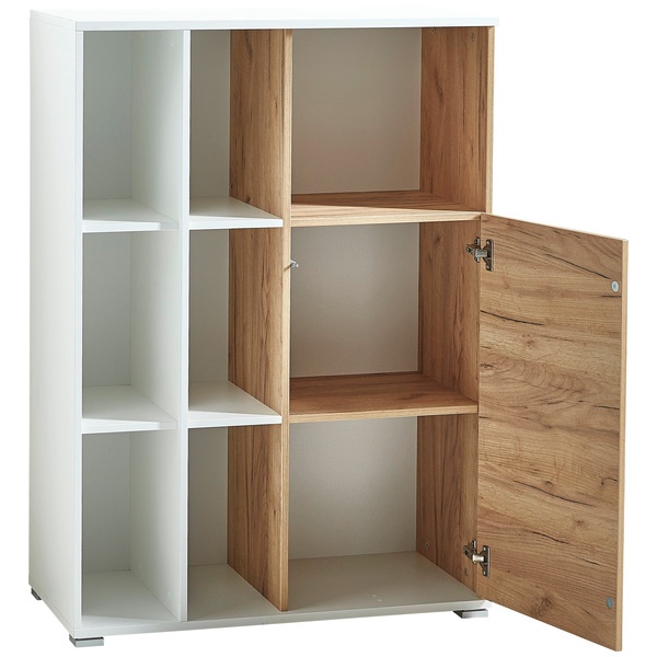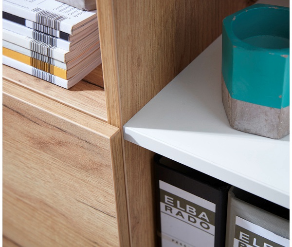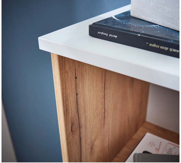 Valkoisen ja Navarra-tammen sävyjen yhdistelmä antaa hyllylle raikkaan ja ajattoman ulkonäön, joka istuu täydellisesti nykyaikaiseen sisustukseen. Kestävä kalustelevy, melamiinihartsipinnoite ja tukevat ABS-kanttaukset varmistavat pitkäikäisyyden ja helppohoitoisuuden.