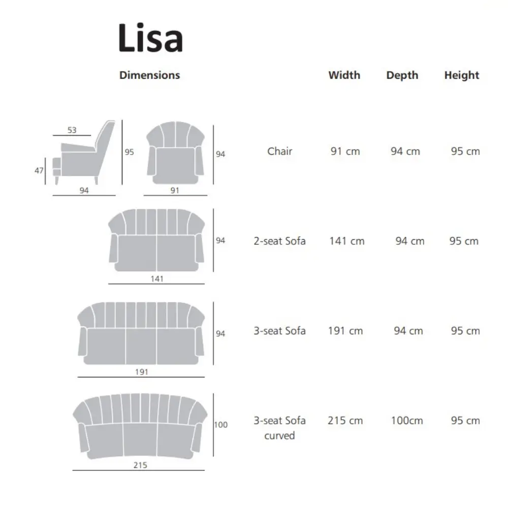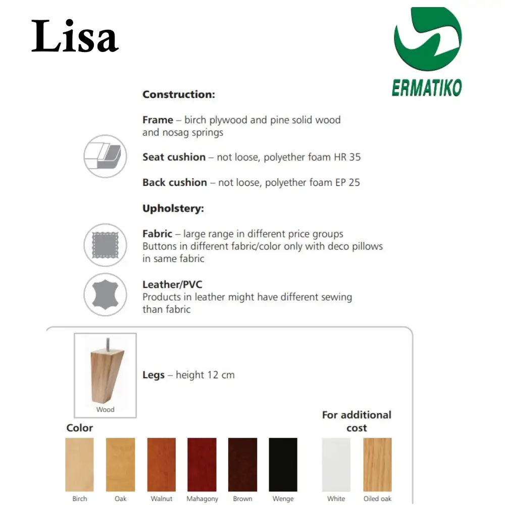 Lisa nojatuoli tarjoaa elegantin korkeaselkäisen muotoilun, jossa nosag-jousitus, laadukkaat pehmusteet ja viimeistellyt nappikoristeet tuovat ylellistä istuinmukavuutta. Monipuoliset nahka- ja kangasverhoiluvaihtoehdot tekevät siitä helposti omaan sisustukseen täydellisesti sopivan valinnan.
