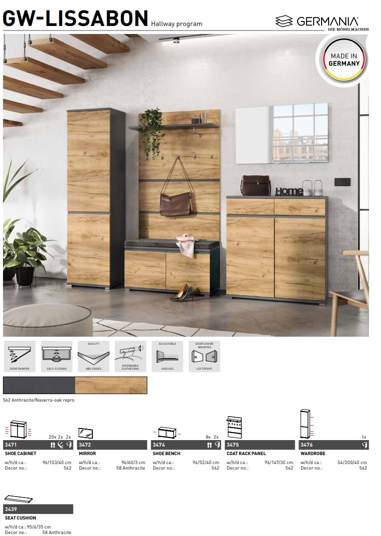 Lissabon kenkäpenkki 3474 tarjoaa modernin designin, joustavan säilytystilan ja laadukkaan rakenteen kahdessa elegantissa sävyssä — jalopyökki ja navarra tammi/antrasiitti — täydentäen eteisesi tyylikkäästi ja käytännöllisesti.