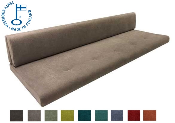 Pikkupehmo taittopatjassa selkänoja avautuu levitettäessä ja lisätilauksesta kahdella käsinojatyynyllä. Taittopatja toimi päivisin kauniina sohvana ja iltaisin siitä saa käännettynä hyvän vuoteen. Huolellisesti suunniteltu ja tehty kokonaisuus; istuimessa reisituki, etupyöristys, vanutus ja napitus istuinosassa. Etuselässä pyöristys ja vanutus. Lisätilauksesta sivun alareunasta käsinojatyynyt.