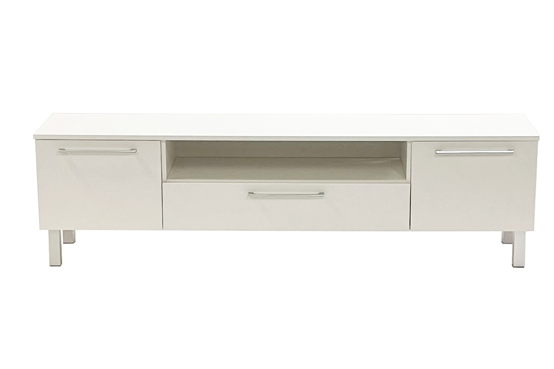 Tv-tasossa on kaksi kaappia, joissa kummassakin on korkeussäädettävä hylly, tarjoten joustavuutta erilaisten laitteiden ja tavaroiden säilytykseen. Keskellä oleva leveä laatikko metallikiskoilla sekä avohylly tuovat lisää käytännöllisyyttä ja helppoa järjestystä olohuoneeseen.