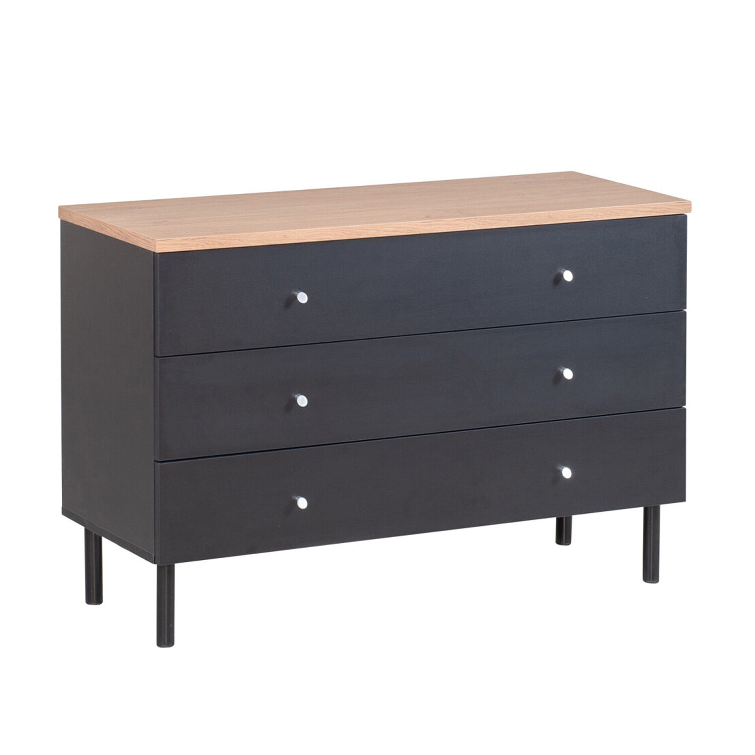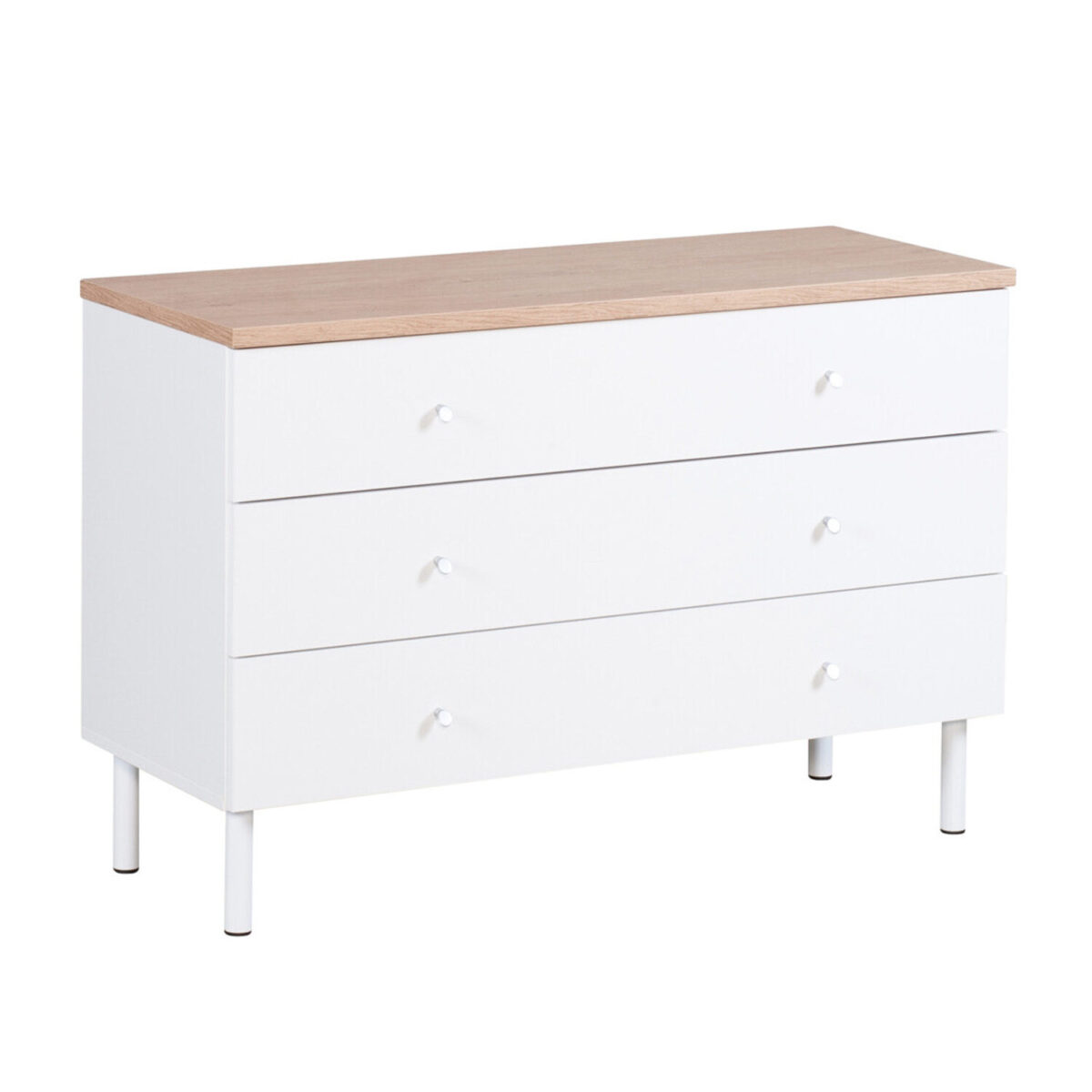 Lipaston laatikosto on valmistettu vanerista ja kalustelevystä, jotka takaavat kestävyyden ja pitkän käyttöiän arjessa. Alumiininen vedin ja 15 cm korkeat maalatut metallijalat tuovat lipastoon vakautta sekä tyylikkään, ilmavan ulkonäön.