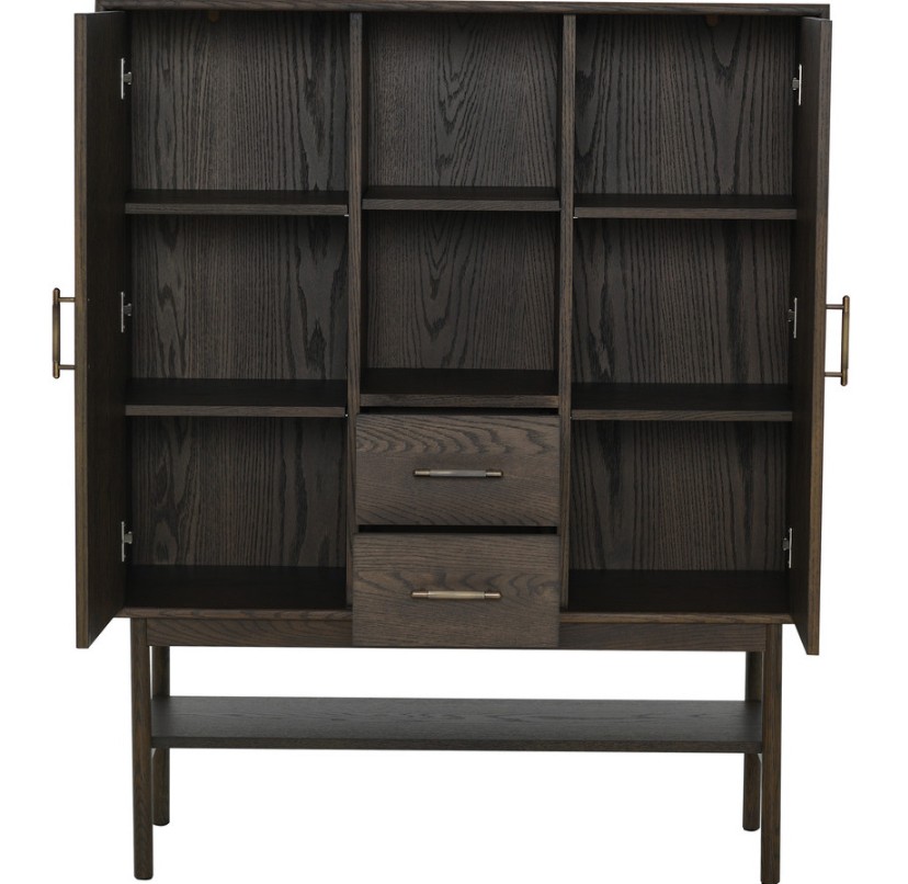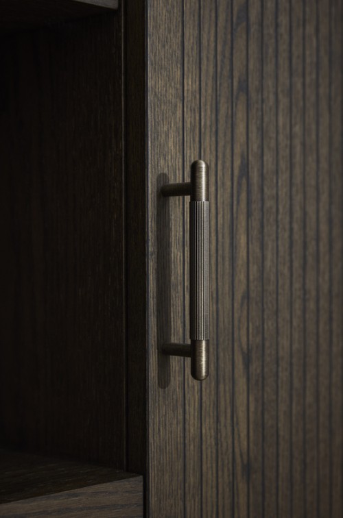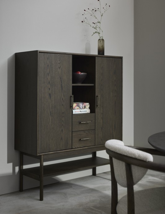 Lyon-kaapissa yhdistyvät elegantti tammiviilu, rimaovet ja messinkiset yksityiskohdat. Kaapissa on kaksi kaappia ja kaksi vetolaatikkoa soft-close-mekanismilla. Keskeltä kaappia löytyy avohylly välihyllyllä. Korkeat jalat antavat sille modernin ja kevyen ilmeen.