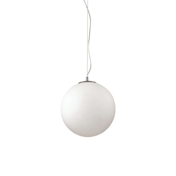 - Moderni pallon muotoinen riippuvalaisin jossa tyylikäs käsin puhallettu valkoinen happokäsitelty lasikupu. Desing Italia.