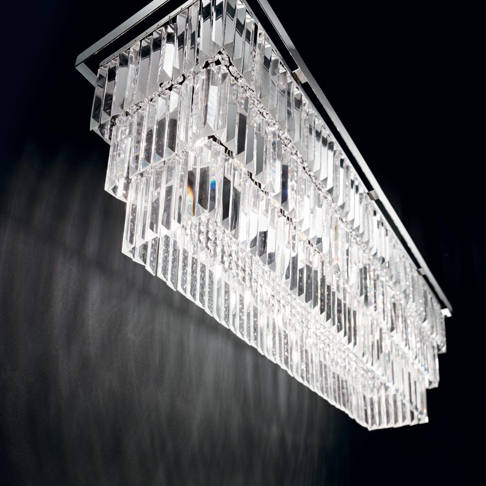 Koriste-elementit on valmistettu kahdeksankulmaisista kristalleista sekä läpinäkyvistä kristallitangoista, jotka taittavat valoa kauniisti ja luovat tilaan eloisan, hohtavan tunnelman. Kromi- tai kultarunkoinen metallikehys korostaa kristallien kirkkautta ja viimeistelee valaisimen ylellisen kokonaisuuden.