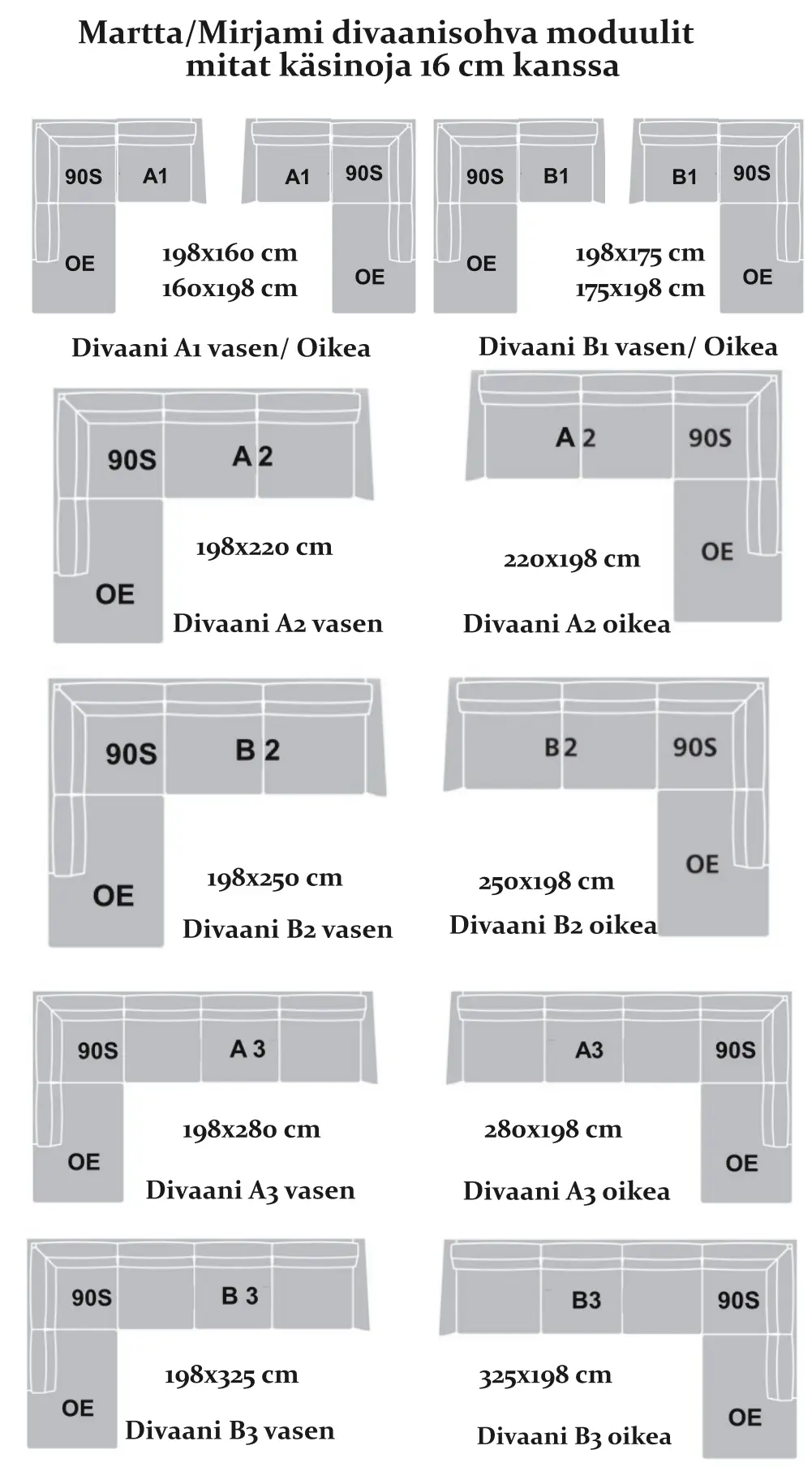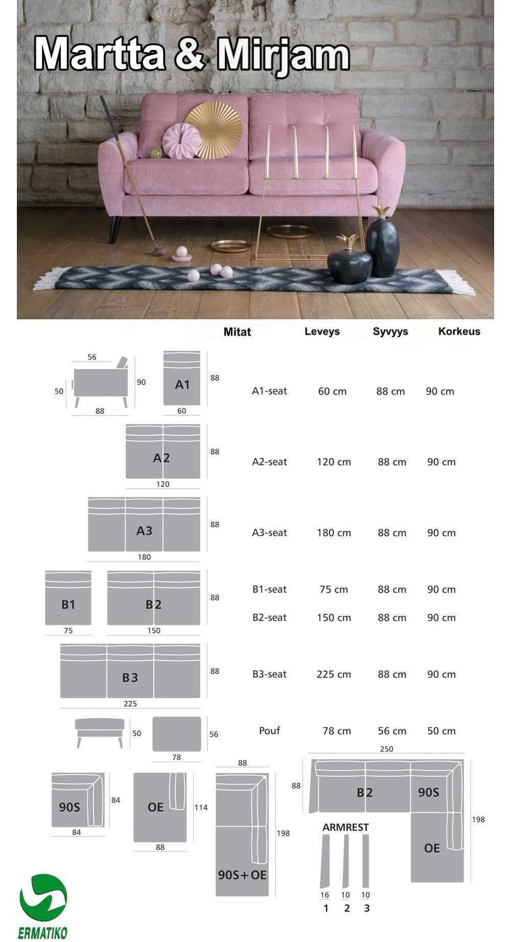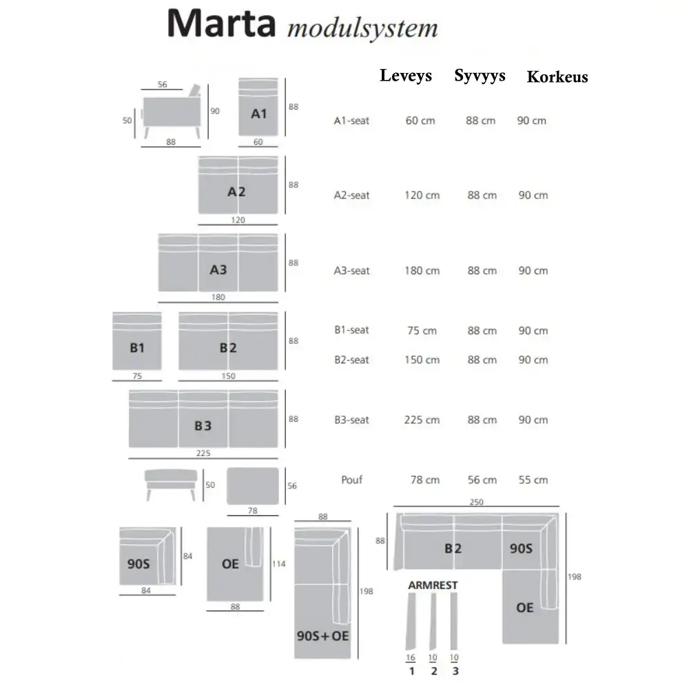 | cm | cm | cm | cm | cm | cm | cm | 46 cm | cm | 56 cm | 18 cm | cm | cm | cm | cm | cm | cm | cm | Kaareva käsinoja 10 cm, Muoto käsinoja 16 cm, Suora käsinoja 10 cm | Irrallinen istuintyyny, Istuimissa zigzag jousitus, istuintyyny vaahtomuovi 35HR, Vanu, Verhoilu ei ole irrotettavissa | Irallinen selkänojatyyny, Vaahtomuovi HR25EP, Verhoilu ei ole irrotettava | cm | cm | cm | cm | cm | cm | cm | cm | cm | cm | Aracon kangas, Hygge kangas, Monolith kangas, Orinoco kangas | Jalat massiivipuuta, Jalat metallia, Massiivipuu, Vaneri | Musta | Ermatiko värit | cm | Täystakuu tuotteelle 2 vuotta | Tilaustuote | Istuinosien kiinnitys tapahtuu pikaliittimillä (kiinteänä istuinosissa), Toimitus moduulit omana pakettina | kg | Viro | cm | cm | cm |