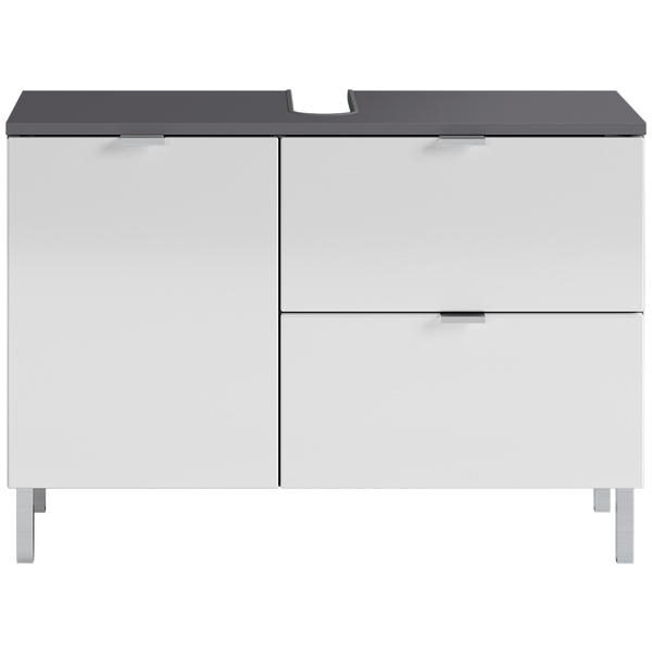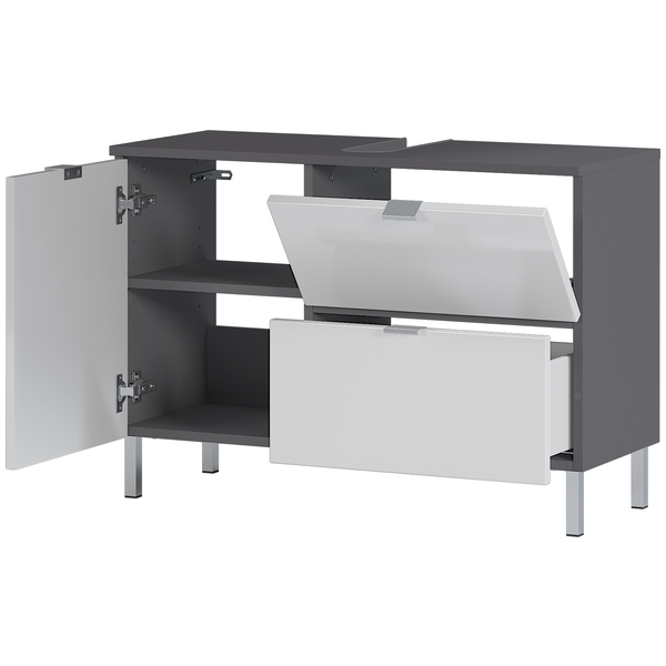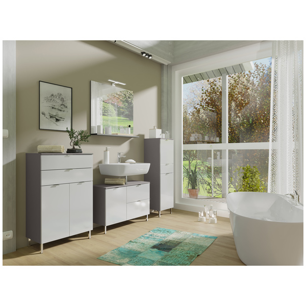 Mauresa allaskaappi 8530 yhdistää grafiitin ja valkoisen sävyt näyttäväksi kokonaisuudeksi, joka sopii täydellisesti sekä minimalistiseen että moderniin kylpyhuoneeseen. Sen selkeälinjainen design tekee tilasta siistin ja harmonisen.
