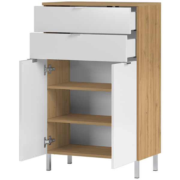Kolme vetolaatikkoa ja kaksi korkeussäädettävää hyllyä tarjoavat runsaasti tilaa pyyhkeille, kosmetiikalle ja muille kylpyhuonetarvikkeille. Tilat on suunniteltu helpottamaan arkea ja pitämään kylpyhuoneesi siistinä ja järjestyksessä.