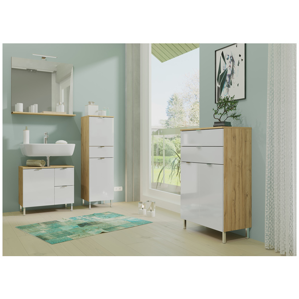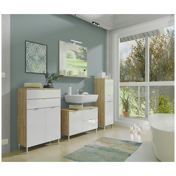Mauresa kaappi 8531 yhdistää raikkaan valkoisen ja lämpimän tammen sävyiset yksityiskohdat, tuoden kylpyhuoneeseesi modernin ja harmonisen ilmeen. Selkeälinjainen design tekee kaapista näyttävän ja helposti yhdisteltävän erilaisiin sisustustyyleihin.