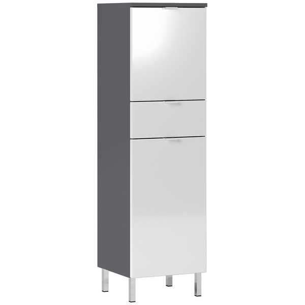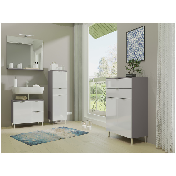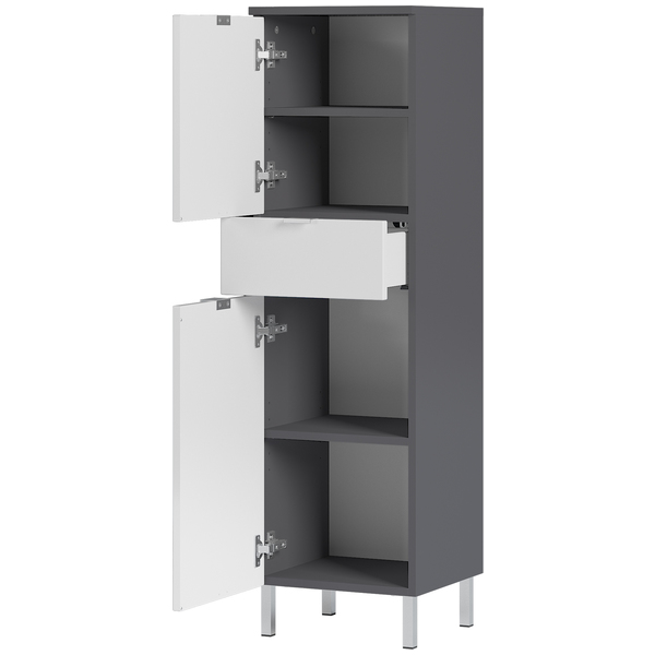 • Mauresa kylpyhuone sarjan kaappi. Kaapissa on ylhäällä yksi kaappi yhdellä korkeussäädettävällä hyllyllä. Alapuolella 1 vetolaatikko jonka alapuolella toinen kaappi 1 korkeussäädettävä hyllyllä. Toimitus osissa.