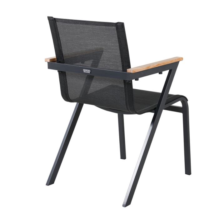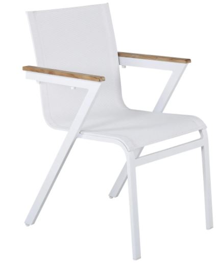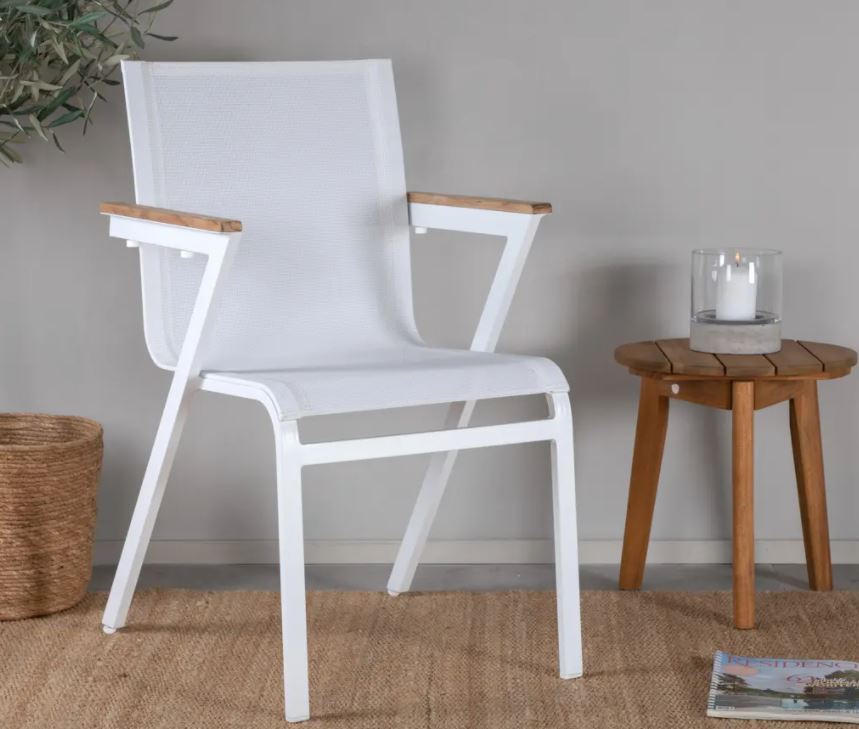 Mexico-sarjan laadukas tuoli, jonka voit yhdistää moneen ruokapöytään. Käsinojat on valmistettu tiikistä luomaan mukavan yksityiskohdan yksiväriseen istuimeen. Tuolit ovat pinottavia, joten niiden säilytys on helppoa. Runko alumiinia ja istuin Textilene kangasta. Textilene on synteettinen kangas, joka on valmistettu PVC-käsitellystä polyesteristä. Materiaali on vedenpitävä ja UV-käsitelty. Tällä tuolilla luot lisää tyylikästä viihtyvyyttä terassillesi.