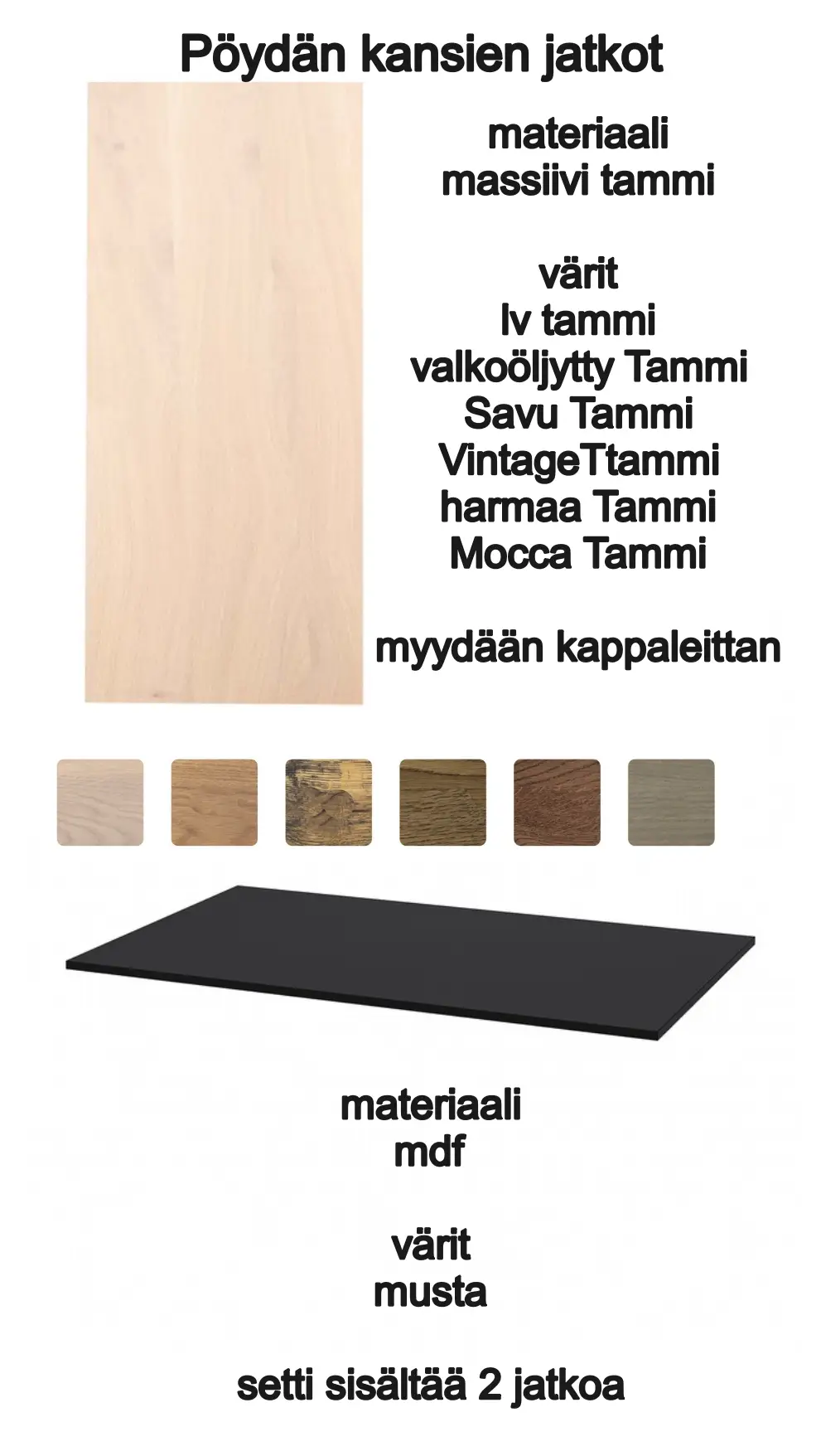 • Lisähinnasta voit myös ostaa öljypullon huoltaaksesi pöytää aina kun on tarve. Huomioithan että ilman kosteus- ja kuivuusolosuhteiden vaihtelut saattavat aiheuttaa halkeamia massiivipuisiin pöytiin. Tämä on normaalia massiivipuisissa huonekaluissa. Mahdolliset halkeamat voidaan täyttää puukitillä.