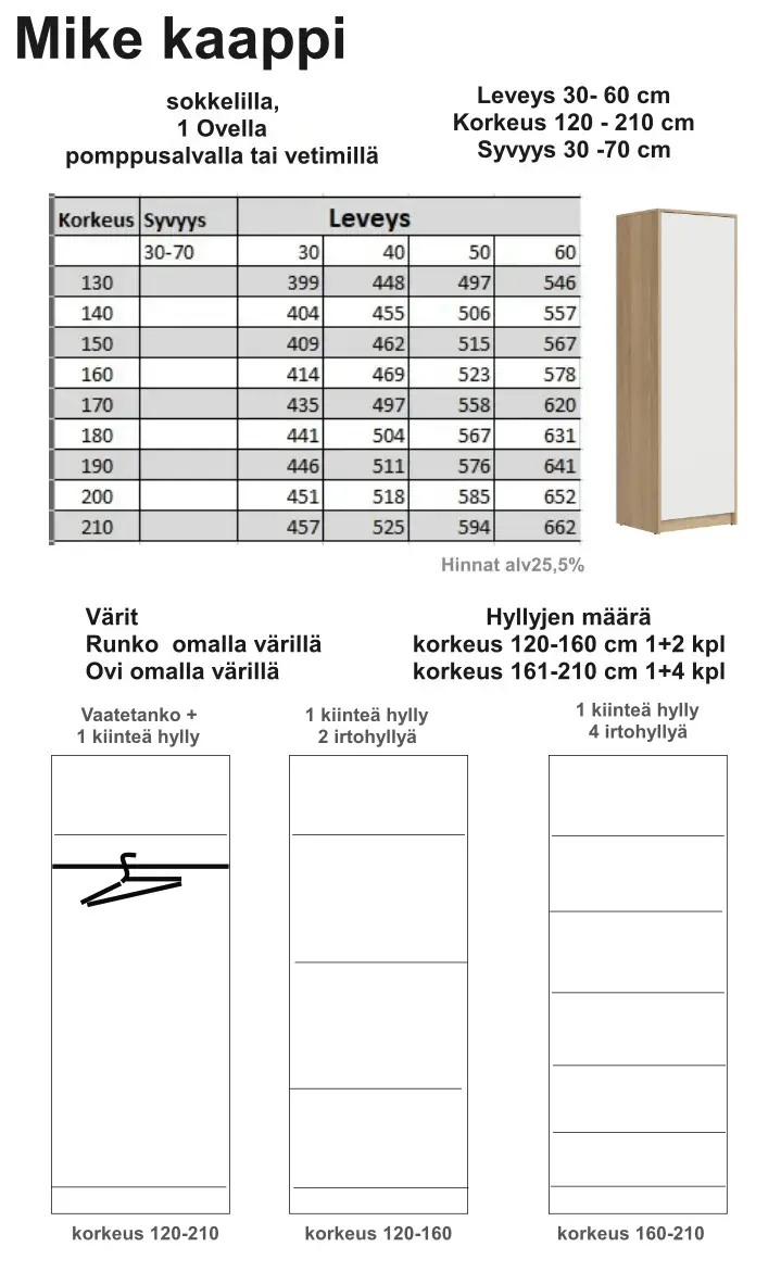 Mike on korkealaatuinen, Suomessa valmistettu kaappi, joka mukautuu täydellisesti tarpeisiisi. Valitse leveys, syvyys ja korkeus sentin tarkkuudella – halutessasi jopa millimetrin välein. Tyylikkäässä kaapissa on vakiona on 1 kiinteä ja 2 säädettäväa hyllyä ja voit tilata lisähyllyjä tarpeen mukaan. Voit valita myös kaappiin tangon j a 1 kiinteän hyllyn – lisähyllyjä myös tilattavissa. Mike kaappi toimitetaan sokkelilla