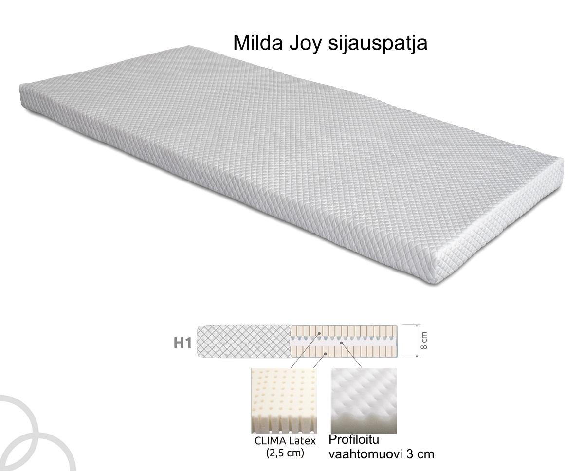 MILDA-Joy sijauspatja tarjoaa kolme ylellistä kerrosta, jotka nostavat nukkumismukavuuden täysin uudelle tasolle. MILDA Joy on 8 cm paksu ja yhdistää 3 cm profiloidun HR-vaahdon sekä molemmin puolin 2,5 cm Clima-lateksikerrokset, jotka tuovat hengittävyyttä, pehmeyttä ja kehon mukaan muotoutuvaa tukea. Voit valita sijauspatjaan 3 eri kankasverhoilua.