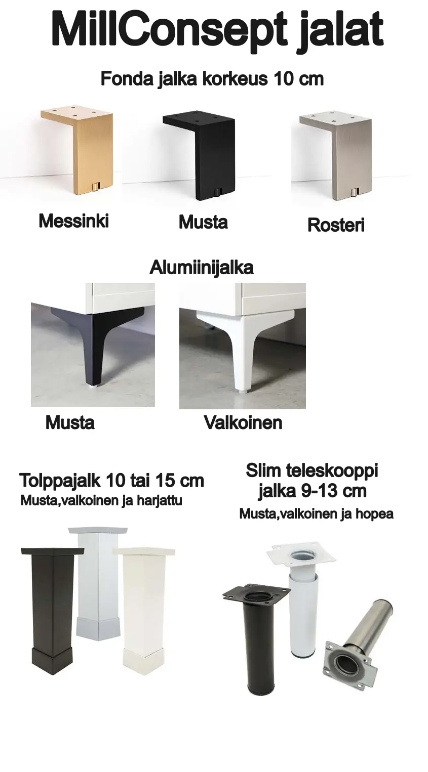 Korkealaatuinen kotimainen Mill Consept tuotesarjan jalat. Hinnat on kappale hintoja