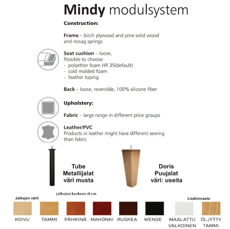 Mindi-nojatuoli on valmistettu tukevasta massiivipuu- ja vanerirungosta, joka takaa kestävyyden ja pitkäikäisyyden. Verhoiluksi voit valita neljästä yksivärisestä kankaasta – Aragon, Hygge, Monolith tai Orinoco – tai tuoda ylellisyyttä nahan kaltaisella Preston-kankaalla. Lisäksi saatavilla ovat kuviolliset Alknis- ja Mesthill-kankaat, joko kokonaan tai osittain kuviollisina. Näin voit luoda nojatuolista juuri omaan kotiisi sopivan tyylin ja tunnelman.
