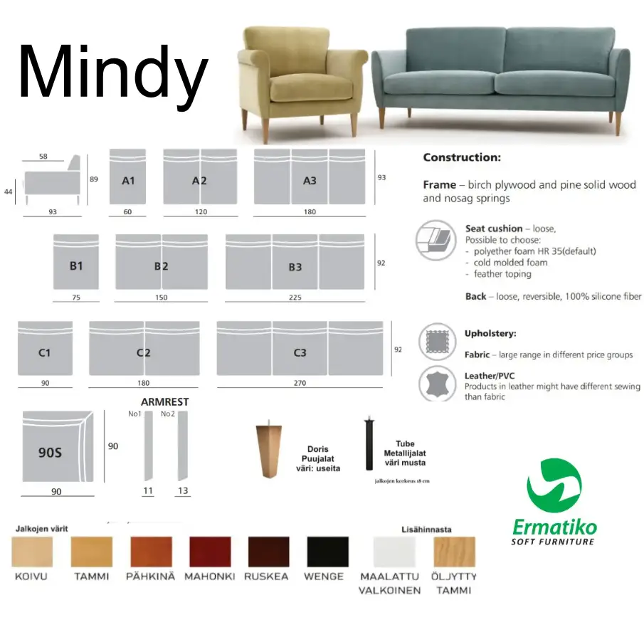 Mindi-nojatuoli yhdistää modernin muotoilun, erinomaisen istuinmukavuuden ja monipuoliset räätälöintimahdollisuudet. No-sag-jousitus, laadukkaat pehmusteet ja vaihdettavat istuintäytteet tarjoavat täydellisen mukavuuden, saatavana kahdella eri käsinojavaihtoehdolla ja usealla eri kangas- ja jalkavaihtoehdoilla.