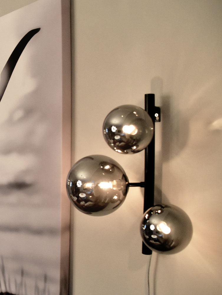 Tyylikäs metallirunkoinen Molekyl seinävalaisin tuo sisustukseen persoonallista ilmettä ja modernia designia. Pallonmuotoiset lasikuvut ja metallirunko muodostavat näyttävän, molekyylimäisen kokonaisuuden, joka toimii yhtä aikaa valaisimena ja sisustuselementtinä. Musta ja messinkinen värivaihtoehto sopivat täydellisesti sekä moderniin että klassisempaan sisustukseen.