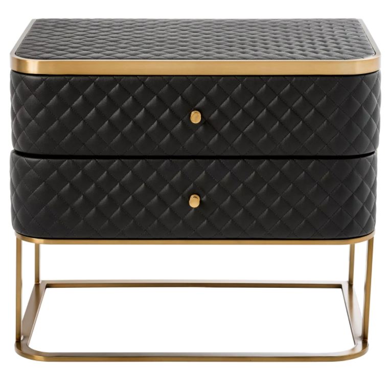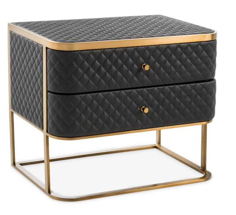 Monfort-yöpöytä hurmaa pehmeillä kaarillaan ja vintage-ulkoasullaan, jotka tekevät siitä makuuhuoneen näyttävän katseenvangitsijan. Tikatun mustan keinonahan ja messinkiviimeistellyn metallirungon yhdistelmä luo ylellisen ja elegantin kokonaisuuden.