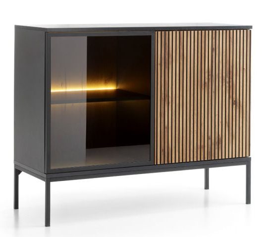 Mustaksi pulverimaalatut 18 cm korkeat metallijalat tuovat ilmavuutta ja vakautta, ja LED-valaistus on helppo kytkeä päälle erillisestä virtakytkimestä. Käyttäjä voi myös valita, kummalle puolelle lasioven ja valaistuksen asentaa, mikä tekee Mooa-senkistä erityisen muunneltavan ja tilaan sopivan ratkaisun.
