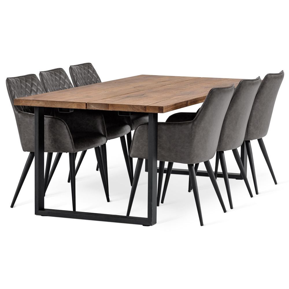 Ryhmään sisältyy 6 kappaletta harmaita Nova-tuoleja, joissa mustat metallijalat ja harmaa keinonahkaverhoilu tuovat modernia keveyttä rustiikkisen pöydän rinnalle. Ergonominen muotoilu ja miellyttävä istuinkorkeus takaavat hyvän istuinmukavuuden myös pidempiin ruokailuhetkiin.
