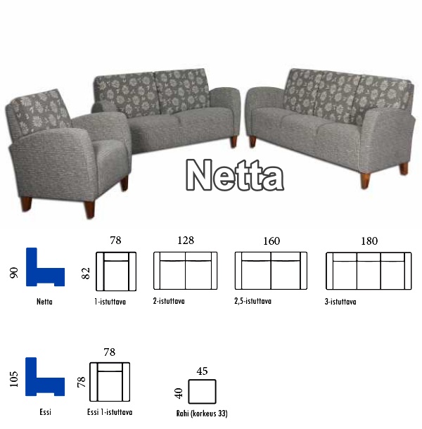Kotimainen pienen tilan napakka matalaselkäinen Netta sohva omaa kauniin sekä yksinkertaisen muotoilun. Netta sohvien ja nojatuolien istuinsyvyys on tavallista pienempi ja näin se tarjoaa ryhdikkään istuma-asennon! Netta sopii juuri sinulle, jos haet siroa sekä kodikkaasti muotoiltua sohvaa. Kiinteästi verhoiltujen selkä- ja istuintyynyjen ansiosta sohva säilyy ryhdikkäänä vuosia. Korkeat jalat helpottavat siivousta ja siirtelyä. Sohvan etujalat ovat 14 cm ja takajalat 12 cm.  Sohvan runko on valmistettu laadukkaasta massiivihavupuusta sekä koivuvanerista. Lisätarvikkeista voit tilata sohvaan käsinojasuojaparin tai rahin.
