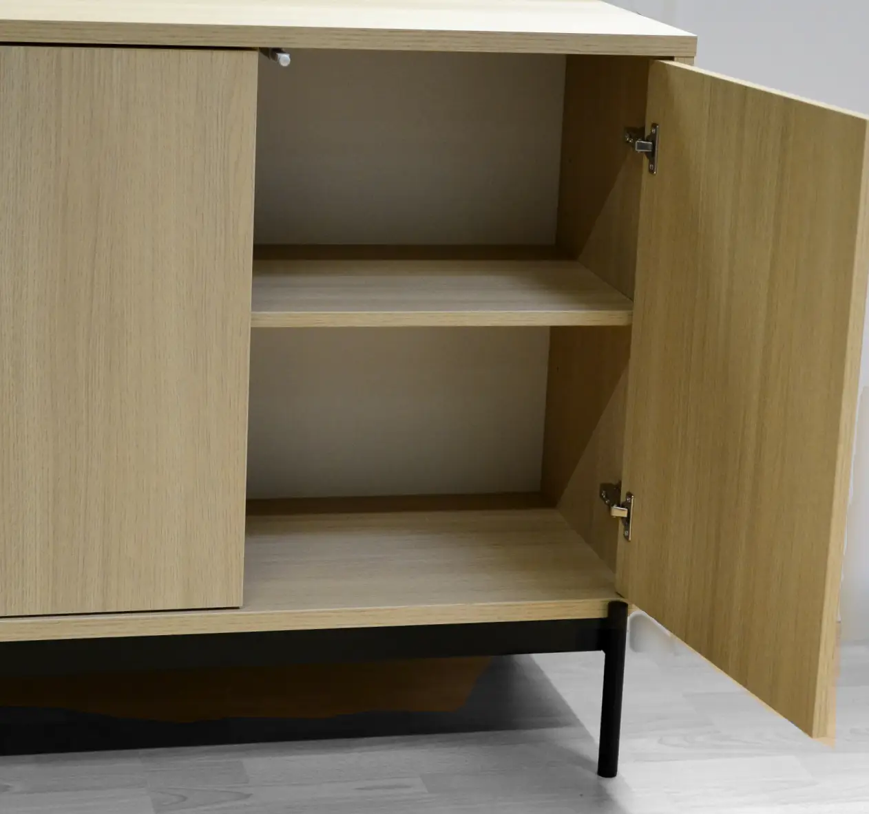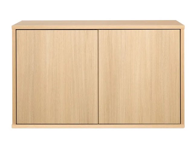 Kaksi push-to-open ovea avautuvat kevyesti painamalla, ja niiden takana olevat säädettävät hyllyt tarjoavat runsaasti säilytystilaa pienestä koostaan huolimatta. Selkeälinjainen muotoilu ja huolellinen viimeistely tekevät tasosta katseenvangitsijan kodin eri tiloihin.