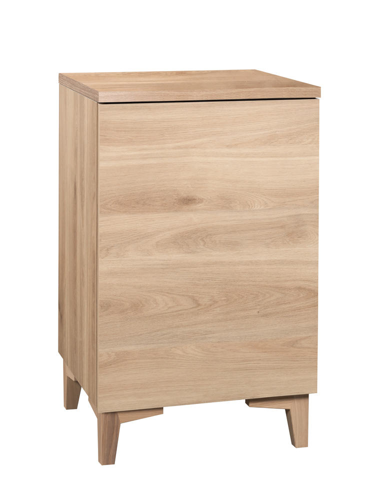 Rakenne on tehty vahvasta kalustelevystä, ja kannen voit valita joko hunaja tammesta tai mustasta tai valkoisesta maalatusta MDF-levystä – molemmat vaihtoehdot tarjoavat tyylikkyyttä ja pitkäikäisyyttä. 13 cm korkeat massiivipuiset jalat antavat kaapille kevyen, ilmavan ilmeen ja tekevät sen sijoittamisesta helppoa eri tiloihin. Jalat voit valita joko tammen tai valkoisen värisenä Oven saranat ovat vaihdettavissa oikealle tai vasemmalle, joten kaappi mukautuu helposti erilaisiin tilaratkaisuihin ja käyttötarpeisiin.