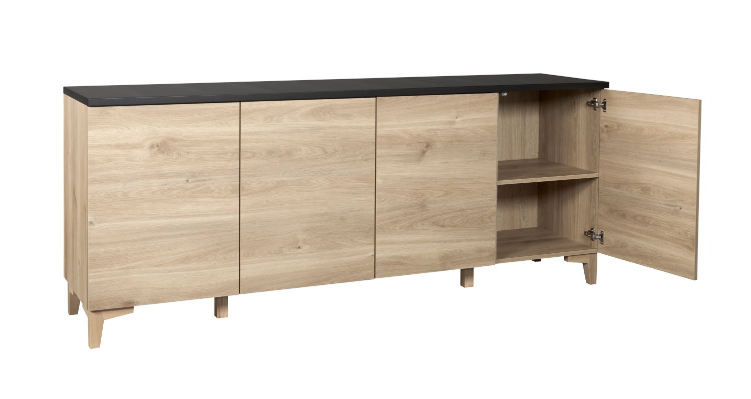 Neljä kaappia on varustettu push-open mekanismilla, joka tekee avaamisesta kevyttä ja miellyttävää ilman vetimiä. 13 cm korkeat massiivipuiset jalat antavat kaapille kevyen, ilmavan ilmeen ja tekevät sen sijoittamisesta helppoa eri tiloihin. Jalat voit valita joko tammen tai valkoisen värisenä